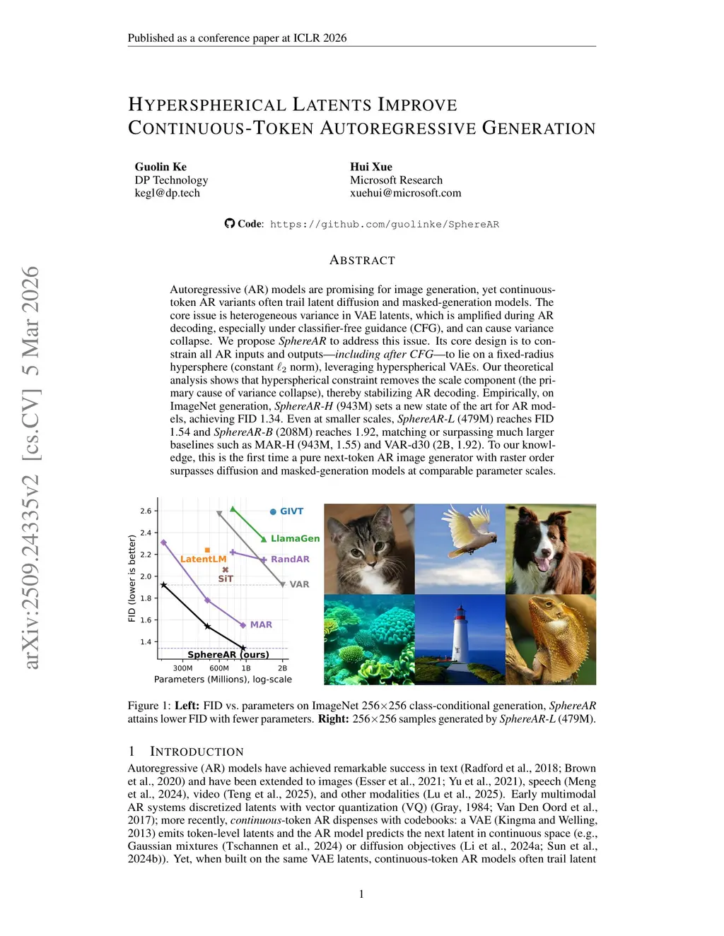 Autoregressive (AR) models are promising for image generation, yet continuous-token AR variants often trail latent diffusion and masked-generation models. The core issue is heterogeneous variance in VAE latents, which is amplified during AR decoding, especially under classifier-free guidance (CFG), and can cause variance collapse. We propose SphereAR to address this issue. Its core design is to constrain all AR inputs and outputs -- including after CFG -- to lie on a fixed-radius hypersphere (constant norm), leveraging hyperspherical VAEs. Our theoretical analysis shows that hyperspherical constraint removes the scale component (the primary cause of variance collapse), thereby stabilizing AR decoding. Empirically, on ImageNet generation, SphereAR-H (943M) sets a new state of the art for AR models, achieving FID 1.34. Even at smaller scales, SphereAR-L (479M) reaches FID 1.54 and SphereAR-B (208M) reaches 1.92, matching or surpassing much larger baselines such as MAR-H (943M, 1.55) and VAR-d30 (2B, 1.92). To our knowledge, this is the first time a pure next-token AR image generator with raster order surpasses diffusion and masked-generation models at comparable parameter scales.