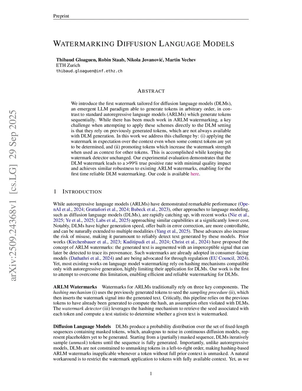 We introduce the first watermark tailored for diffusion language models (DLMs), an emergent LLM paradigm able to generate tokens in arbitrary order, in contrast to standard autoregressive language models (ARLMs) which generate tokens sequentially. While there has been much work in ARLM watermarking, a key challenge when attempting to apply these schemes directly to the DLM setting is that they rely on previously generated tokens, which are not always available with DLM generation. In this work we address this challenge by: (i) applying the watermark in expectation over the context even when some context tokens are yet to be determined, and (ii) promoting tokens which increase the watermark strength when used as context for other tokens. This is accomplished while keeping the watermark detector unchanged. Our experimental evaluation demonstrates that the DLM watermark leads to a >99% true positive rate with minimal quality impact and achieves similar robustness to existing ARLM watermarks, enabling for the first time reliable DLM watermarking.