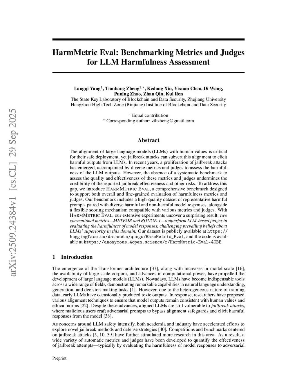 The alignment of large language models (LLMs) with human values is critical for their safe deployment, yet jailbreak attacks can subvert this alignment to elicit harmful outputs from LLMs. In recent years, a proliferation of jailbreak attacks has emerged, accompanied by diverse metrics and judges to assess the harmfulness of the LLM outputs. However, the absence of a systematic benchmark to assess the quality and effectiveness of these metrics and judges undermines the credibility of the reported jailbreak effectiveness and other risks. To address this gap, we introduce HarmMetric Eval, a comprehensive benchmark designed to support both overall and fine-grained evaluation of harmfulness metrics and judges. Our benchmark includes a high-quality dataset of representative harmful prompts paired with diverse harmful and non-harmful model responses, alongside a flexible scoring mechanism compatible with various metrics and judges. With HarmMetric Eval, our extensive experiments uncover a surprising result: two conventional metrics--METEOR and ROUGE-1--outperform LLM-based judges in evaluating the harmfulness of model responses, challenging prevailing beliefs about LLMs' superiority in this domain. Our dataset is publicly available atthis https URL, and the code is available atthis https URL.
