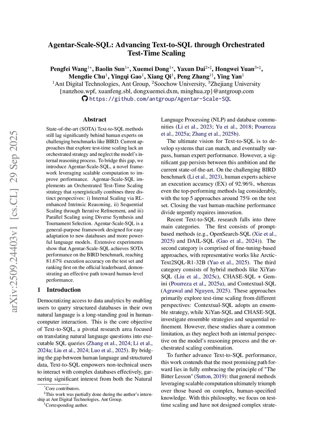 State-of-the-art (SOTA) Text-to-SQL methods still lag significantly behind human experts on challenging benchmarks like BIRD. Current approaches that explore test-time scaling lack an orchestrated strategy and neglect the model's internal reasoning process. To bridge this gap, we introduce Agentar-Scale-SQL, a novel framework leveraging scalable computation to improve performance. Agentar-Scale-SQL implements an Orchestrated Test-Time Scaling strategy that synergistically combines three distinct perspectives: i) Internal Scaling via RL-enhanced Intrinsic Reasoning, ii) Sequential Scaling through Iterative Refinement, and iii) Parallel Scaling using Diverse Synthesis and Tournament Selection. Agentar-Scale-SQL is a general-purpose framework designed for easy adaptation to new databases and more powerful language models. Extensive experiments show that Agentar-Scale-SQL achieves SOTA performance on the BIRD benchmark, reaching 81.67% execution accuracy on the test set and ranking first on the official leaderboard, demonstrating an effective path toward human-level performance.