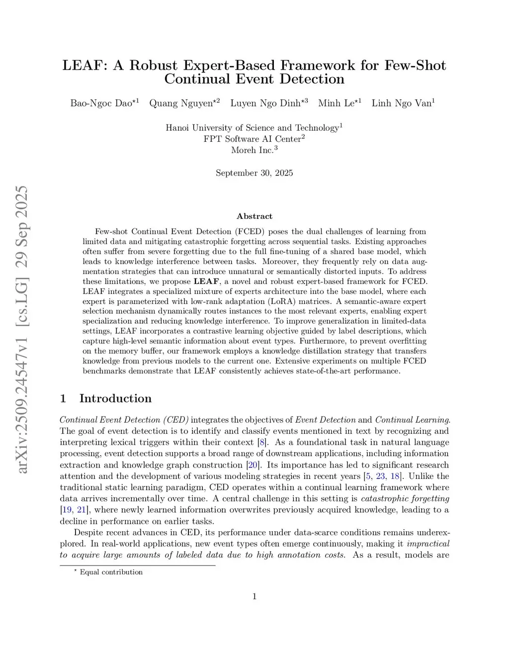 LEAF: A Robust Expert-Based Framework for Few-Shot Continual Event Detection