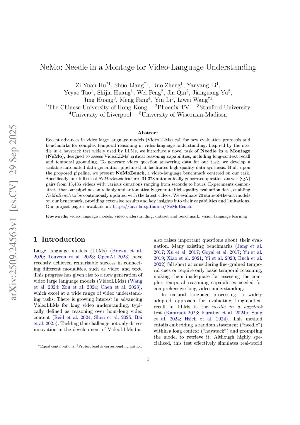 Recent advances in video large language models (VideoLLMs) call for new evaluation protocols and benchmarks for complex temporal reasoning in video-language understanding. Inspired by the needle in a haystack test widely used by LLMs, we introduce a novel task of Needle in a Montage (NeMo), designed to assess VideoLLMs' critical reasoning capabilities, including long-context recall and temporal grounding. To generate video question answering data for our task, we develop a scalable automated data generation pipeline that facilitates high-quality data synthesis. Built upon the proposed pipeline, we present NeMoBench, a video-language benchmark centered on our task. Specifically, our full set of NeMoBench features 31,378 automatically generated question-answer (QA) pairs from 13,486 videos with various durations ranging from seconds to hours. Experiments demonstrate that our pipeline can reliably and automatically generate high-quality evaluation data, enabling NeMoBench to be continuously updated with the latest videos. We evaluate 20 state-of-the-art models on our benchmark, providing extensive results and key insights into their capabilities and limitations. Our project page is available at: this https URL.