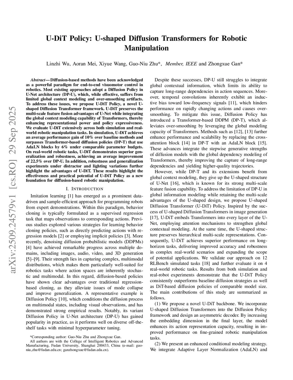 Diffusion-based methods have been acknowledged as a powerful paradigm for end-to-end visuomotor control in robotics. Most existing approaches adopt a Diffusion Policy in U-Net architecture (DP-U), which, while effective, suffers from limited global context modeling and over-smoothing artifacts. To address these issues, we propose U-DiT Policy, a novel U-shaped Diffusion Transformer framework. U-DiT preserves the multi-scale feature fusion advantages of U-Net while integrating the global context modeling capability of Transformers, thereby enhancing representational power and policy expressiveness. We evaluate U-DiT extensively across both simulation and real-world robotic manipulation tasks. In simulation, U-DiT achieves an average performance gain of 10\% over baseline methods and surpasses Transformer-based diffusion policies (DP-T) that use AdaLN blocks by 6\% under comparable parameter budgets. On real-world robotic tasks, U-DiT demonstrates superior generalization and robustness, achieving an average improvement of 22.5\% over DP-U. In addition, robustness and generalization experiments under distractor and lighting variations further highlight the advantages of U-DiT. These results highlight the effectiveness and practical potential of U-DiT Policy as a new foundation for diffusion-based robotic manipulation.