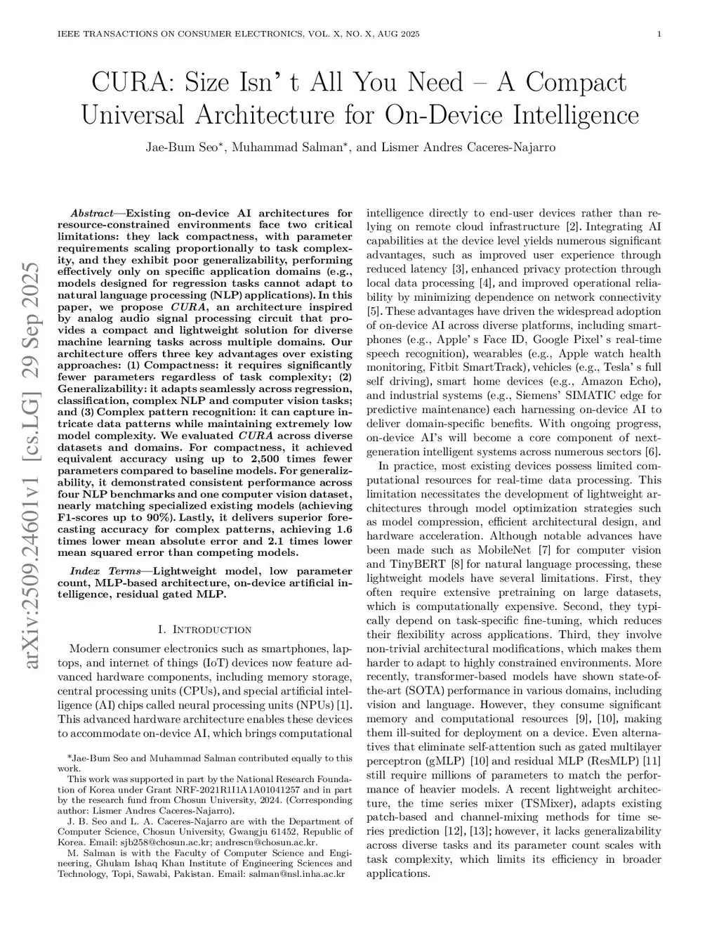 Existing on-device AI architectures for resource-constrained environments face two critical limitations: they lack compactness, with parameter requirements scaling proportionally to task complexity, and they exhibit poor generalizability, performing effectively only on specific application domains (e.g., models designed for regression tasks cannot adapt to natural language processing (NLP) applications). In this paper, we propose CURA, an architecture inspired by analog audio signal processing circuits that provides a compact and lightweight solution for diverse machine learning tasks across multiple domains. Our architecture offers three key advantages over existing approaches: (1) Compactness: it requires significantly fewer parameters regardless of task complexity; (2) Generalizability: it adapts seamlessly across regression, classification, complex NLP, and computer vision tasks; and (3) Complex pattern recognition: it can capture intricate data patterns while maintaining extremely low model complexity. We evaluated CURA across diverse datasets and domains. For compactness, it achieved equivalent accuracy using up to 2,500 times fewer parameters compared to baseline models. For generalizability, it demonstrated consistent performance across four NLP benchmarks and one computer vision dataset, nearly matching specialized existing models (achieving F1-scores up to 90%). Lastly, it delivers superior forecasting accuracy for complex patterns, achieving 1.6 times lower mean absolute error and 2.1 times lower mean squared error than competing models.