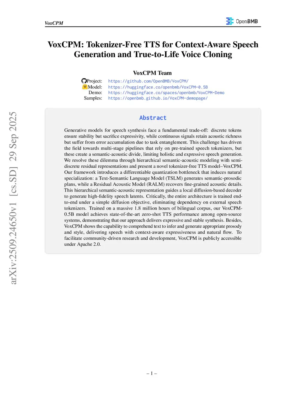 Generative models for speech synthesis face a fundamental trade-off: discrete tokens ensure stability but sacrifice expressivity, while continuous signals retain acoustic richness but suffer from error accumulation due to task entanglement. This challenge has driven the field towards multi-stage pipelines that rely on pre-trained speech tokenizers, but these create a semantic-acoustic divide, limiting holistic and expressive speech generation. We resolve these dilemma through hierarchical semantic-acoustic modeling with semi-discrete residual representations and present a novel tokenizer-free TTS model VoxCPM. Our framework introduces a differentiable quantization bottleneck that induces natural specialization: a Text-Semantic Language Model (TSLM) generates semantic-prosodic plans, while a Residual Acoustic Model (RALM) recovers fine-grained acoustic details. This hierarchical semantic-acoustic representation guides a local diffusion-based decoder to generate high-fidelity speech latents. Critically, the entire architecture is trained end-to-end under a simple diffusion objective, eliminating dependency on external speech tokenizers. Trained on a massive 1.8 million hours of bilingual corpus, our VoxCPM-0.5B model achieves state-of-the-art zero-shot TTS performance among open-source systems, demonstrating that our approach delivers expressive and stable synthesis. Besides, VoxCPM shows the capability to comprehend text to infer and generate appropriate prosody and style, delivering speech with context-aware expressiveness and natural flow. To facilitate community-driven research and development, VoxCPM is publicly accessible under Apache 2.0.