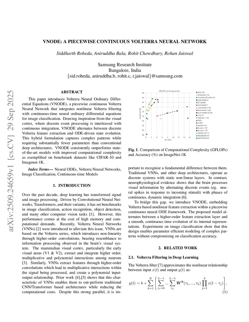 This paper introduces Volterra Neural Ordinary Differential Equations (VNODE), a piecewise continuous Volterra Neural Network that integrates nonlinear Volterra filtering with continuous time neural ordinary differential equations for image classification. Drawing inspiration from the visual cortex, where discrete event processing is interleaved with continuous integration, VNODE alternates between discrete Volterra feature extraction and ODE driven state evolution. This hybrid formulation captures complex patterns while requiring substantially fewer parameters than conventional deep architectures. VNODE consistently outperforms state of the art models with improved computational complexity as exemplified on benchmark datasets like CIFAR10 and Imagenet1K.