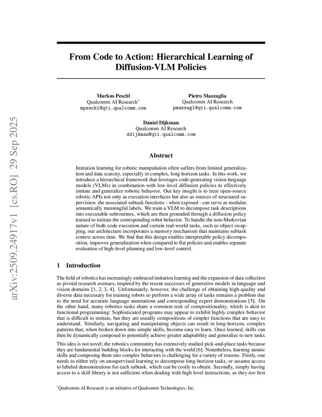 From Code to Action: Hierarchical Learning of Diffusion-VLM Policies
