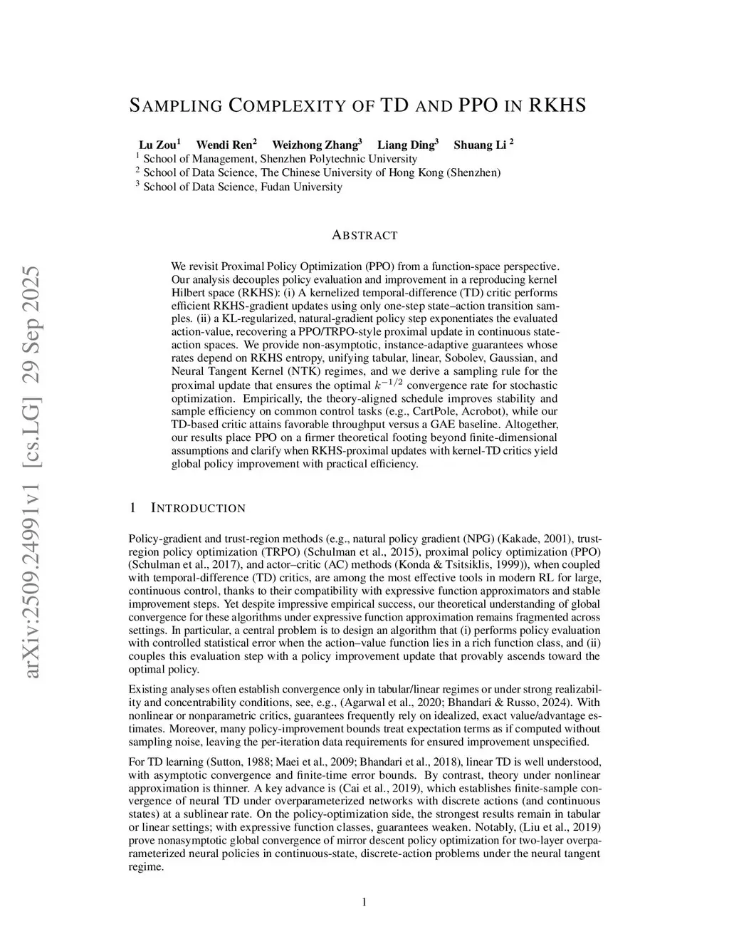 We revisit Proximal Policy Optimization (PPO) from a function-space perspective. Our analysis decouples policy evaluation and improvement in a reproducing kernel Hilbert space (RKHS): (i) A kernelized temporal-difference (TD) critic performs efficient RKHS-gradient updates using only one-step state-action transition samples; (ii) a KL-regularized, natural-gradient policy step exponentiates the evaluated action-value, recovering a PPO/TRPO-style proximal update in continuous state-action spaces. We provide non-asymptotic, instance-adaptive guarantees whose rates depend on RKHS entropy, unifying tabular, linear, Sobolev, Gaussian, and Neural Tangent Kernel (NTK) regimes, and we derive a sampling rule for the proximal update that ensures the optimal convergence rate for stochastic optimization. Empirically, the theory-aligned schedule improves stability and sample efficiency on common control tasks (e.g., CartPole, Acrobot), while our TD-based critic attains favorable throughput versus a GAE baseline. Altogether, our results place PPO on a firmer theoretical footing beyond finite-dimensional assumptions and clarify when RKHS-proximal updates with kernel-TD critics yield global policy improvement with practical efficiency.
