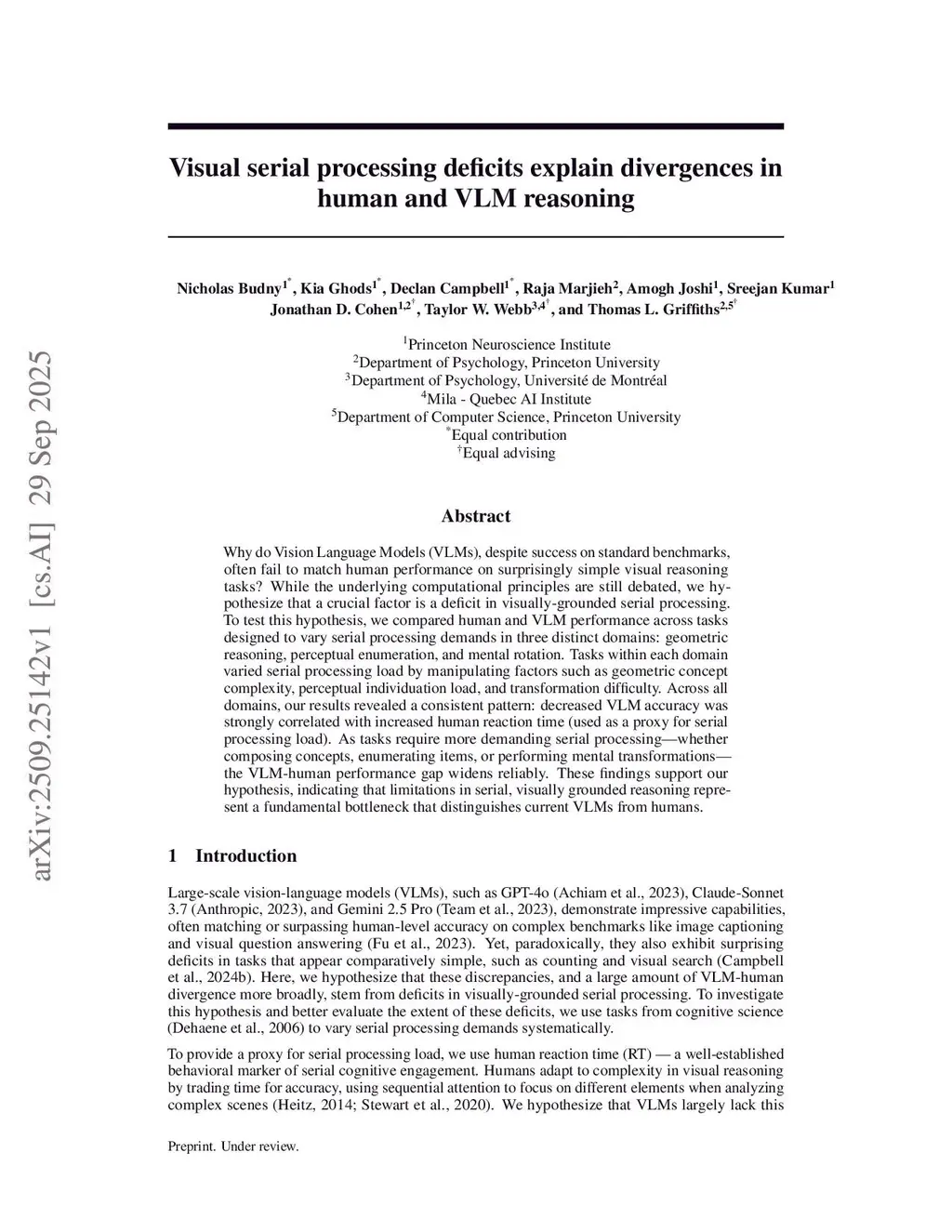 Visual serial processing deficits explain divergences in human and VLM reasoning