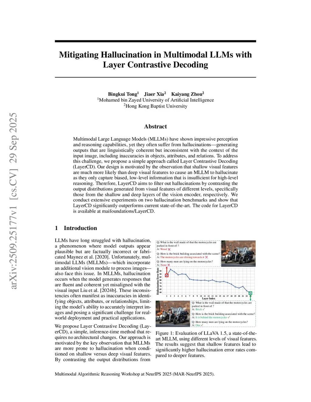 Multimodal Large Language Models (MLLMs) have shown impressive perception and reasoning capabilities, yet they often suffer from hallucinations -- generating outputs that are linguistically coherent but inconsistent with the context of the input image, including inaccuracies in objects, attributes, and relations. To address this challenge, we propose a simple approach called Layer Contrastive Decoding (LayerCD). Our design is motivated by the observation that shallow visual features are much more likely than deep visual features to cause an MLLM to hallucinate as they only capture biased, low-level information that is insufficient for high-level reasoning. Therefore, LayerCD aims to filter out hallucinations by contrasting the output distributions generated from visual features of different levels, specifically those from the shallow and deep layers of the vision encoder, respectively. We conduct extensive experiments on two hallucination benchmarks and show that LayerCD significantly outperforms current state-of-the-art. The code for LayerCD is available atthis https URL.