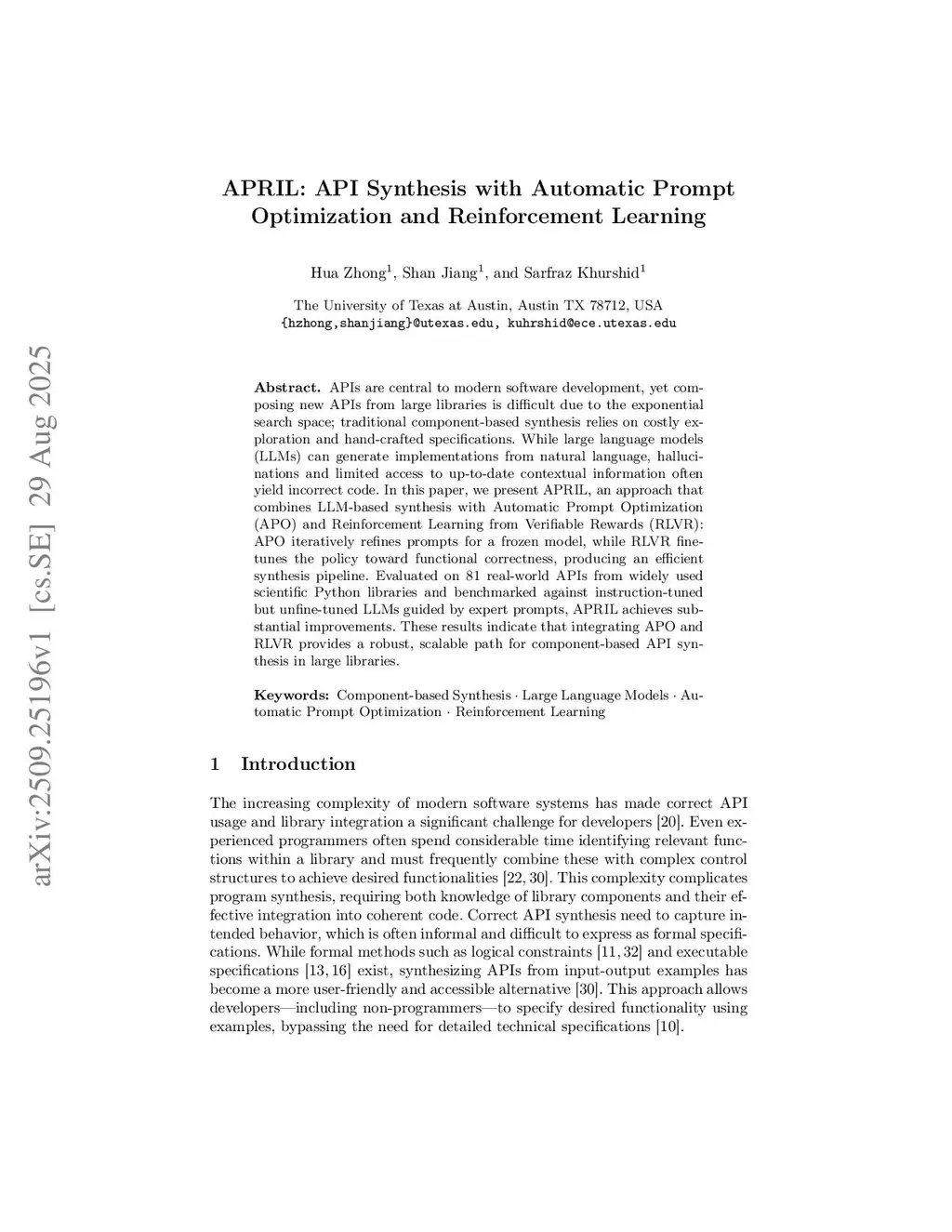 APIs are central to modern software development, yet composing new APIs from large libraries is difficult due to the exponential search space; traditional component-based synthesis relies on costly exploration and hand-crafted specifications. While large language models (LLMs) can generate implementations from natural language, hallucinations and limited access to up-to-date contextual information often yield incorrect code. In this paper, we present APRIL, an approach that combines LLM-based synthesis with Automatic Prompt Optimization (APO) and Reinforcement Learning from Verifiable Rewards (RLVR): APO iteratively refines prompts for a frozen model, while RLVR fine-tunes the policy toward functional correctness, producing an efficient synthesis pipeline. Evaluated on 81 real-world APIs from widely used scientific Python libraries and benchmarked against instruction-tuned but unfine-tuned LLMs guided by expert prompts, APRIL achieves substantial improvements. These results indicate that integrating APO and RLVR provides a robust, scalable path for component-based API synthesis in large libraries.