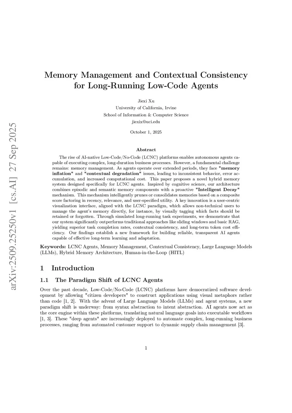 The rise of AI-native Low-Code/No-Code (LCNC) platforms enables autonomous agents capable of executing complex, long-duration business processes. However, a fundamental challenge remains: memory management. As agents operate over extended periods, they face "memory inflation" and "contextual degradation" issues, leading to inconsistent behavior, error accumulation, and increased computational cost. This paper proposes a novel hybrid memory system designed specifically for LCNC agents. Inspired by cognitive science, our architecture combines episodic and semantic memory components with a proactive "Intelligent Decay" mechanism. This mechanism intelligently prunes or consolidates memories based on a composite score factoring in recency, relevance, and user-specified utility. A key innovation is a user-centric visualization interface, aligned with the LCNC paradigm, which allows non-technical users to manage the agent's memory directly, for instance, by visually tagging which facts should be retained or forgotten. Through simulated long-running task experiments, we demonstrate that our system significantly outperforms traditional approaches like sliding windows and basic RAG, yielding superior task completion rates, contextual consistency, and long-term token cost efficiency. Our findings establish a new framework for building reliable, transparent AI agents capable of effective long-term learning and adaptation.