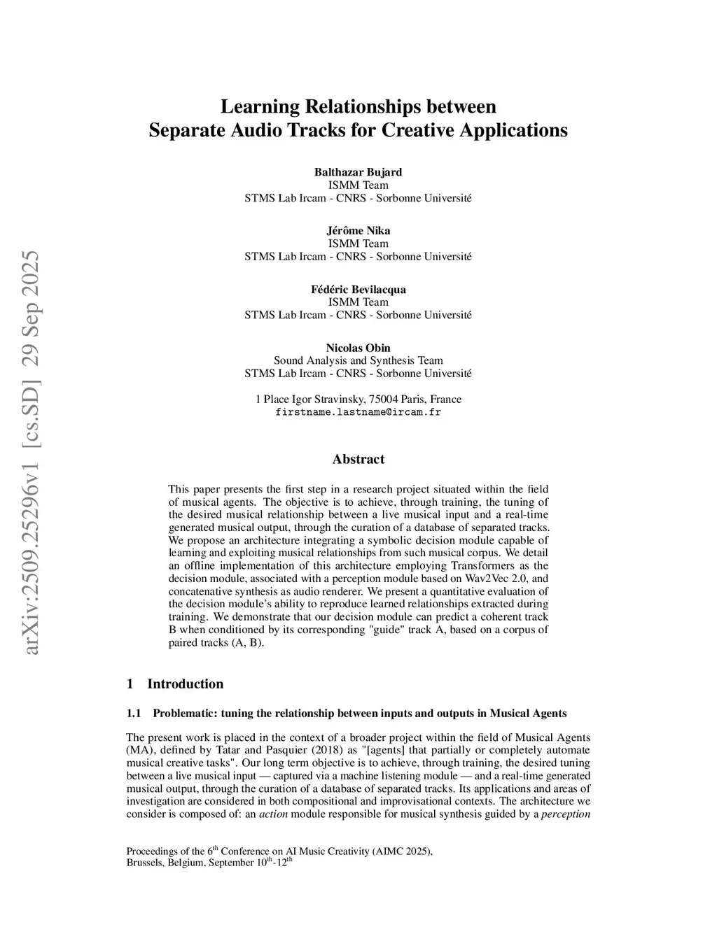 This paper presents the first step in a research project situated within the field of musical agents. The objective is to achieve, through training, the tuning of the desired musical relationship between a live musical input and a real-time generated musical output, through the curation of a database of separated tracks. We propose an architecture integrating a symbolic decision module capable of learning and exploiting musical relationships from such musical corpus. We detail an offline implementation of this architecture employing Transformers as the decision module, associated with a perception module based on Wav2Vec 2.0, and concatenative synthesis as audio renderer. We present a quantitative evaluation of the decision module's ability to reproduce learned relationships extracted during training. We demonstrate that our decision module can predict a coherent track B when conditioned by its corresponding ''guide'' track A, based on a corpus of paired tracks (A, B).