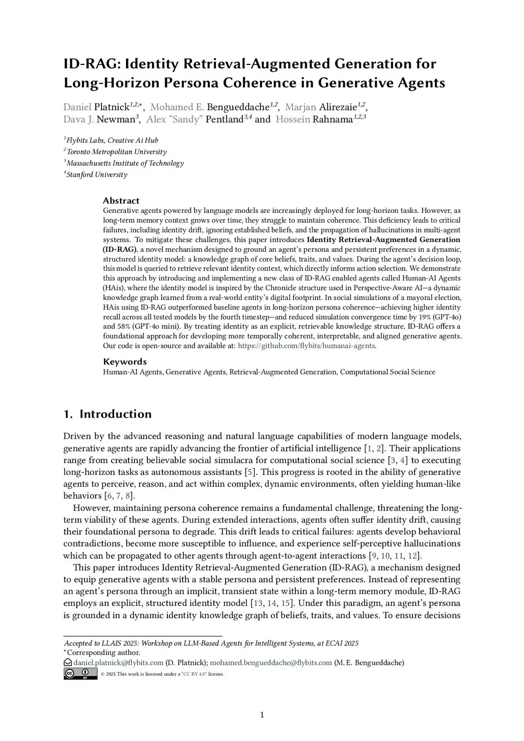 Generative agents powered by language models are increasingly deployed for long-horizon tasks. However, as long-term memory context grows over time, they struggle to maintain coherence. This deficiency leads to critical failures, including identity drift, ignoring established beliefs, and the propagation of hallucinations in multi-agent systems. To mitigate these challenges, this paper introduces Identity Retrieval-Augmented Generation (ID-RAG), a novel mechanism designed to ground an agent's persona and persistent preferences in a dynamic, structured identity model: a knowledge graph of core beliefs, traits, and values. During the agent's decision loop, this model is queried to retrieve relevant identity context, which directly informs action selection. We demonstrate this approach by introducing and implementing a new class of ID-RAG enabled agents called Human-AI Agents (HAis), where the identity model is inspired by the Chronicle structure used in Perspective-Aware AI, a dynamic knowledge graph learned from a real-world entity's digital footprint. In social simulations of a mayoral election, HAis using ID-RAG outperformed baseline agents in long-horizon persona coherence - achieving higher identity recall across all tested models by the fourth timestep - and reduced simulation convergence time by 19% (GPT-4o) and 58% (GPT-4o mini). By treating identity as an explicit, retrievable knowledge structure, ID-RAG offers a foundational approach for developing more temporally coherent, interpretable, and aligned generative agents. Our code is open-source and available at:this https URL.