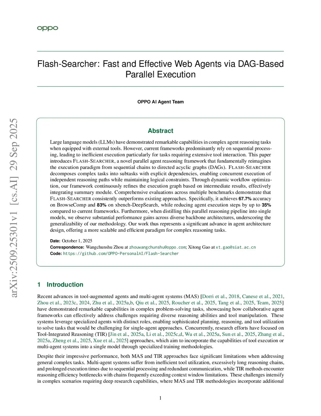 Large language models (LLMs) have demonstrated remarkable capabilities in complex reasoning tasks when equipped with external tools. However, current frameworks predominantly rely on sequential processing, leading to inefficient execution particularly for tasks requiring extensive tool interaction. This paper introduces Flash-Searcher, a novel parallel agent reasoning framework that fundamentally reimagines the execution paradigm from sequential chains to directed acyclic graphs (DAGs). Flash-Searcher decomposes complex tasks into subtasks with explicit dependencies, enabling concurrent execution of independent reasoning paths while maintaining logical constraints. Through dynamic workflow optimization, our framework continuously refines the execution graph based on intermediate results, effectively integrating summary module. Comprehensive evaluations across multiple benchmarks demonstrate that Flash-Searcher consistently outperforms existing approaches. Specifically, it achieves 67.7% accuracy on BrowseComp and 83% on xbench-DeepSearch, while reducing agent execution steps by up to 35% compared to current frameworks. Furthermore, when distilling this parallel reasoning pipeline into single models, we observe substantial performance gains across diverse backbone architectures, underscoring the generalizability of our methodology. Our work thus represents a significant advance in agent architecture design, offering a more scalable and efficient paradigm for complex reasoning tasks.
