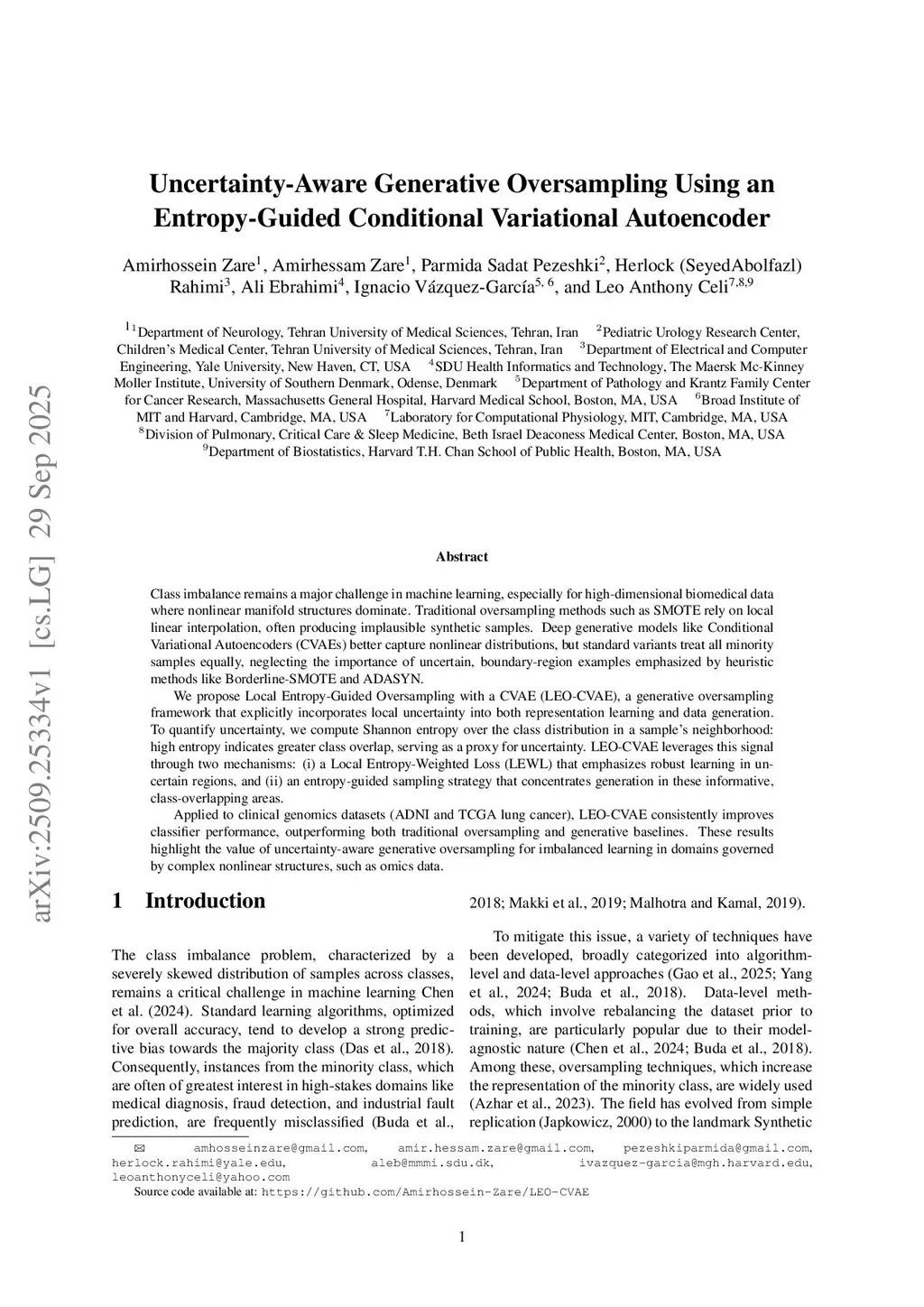 Class imbalance remains a major challenge in machine learning, especially for high-dimensional biomedical data where nonlinear manifold structures dominate. Traditional oversampling methods such as SMOTE rely on local linear interpolation, often producing implausible synthetic samples. Deep generative models like Conditional Variational Autoencoders (CVAEs) better capture nonlinear distributions, but standard variants treat all minority samples equally, neglecting the importance of uncertain, boundary-region examples emphasized by heuristic methods like Borderline-SMOTE and ADASYN.We propose Local Entropy-Guided Oversampling with a CVAE (LEO-CVAE), a generative oversampling framework that explicitly incorporates local uncertainty into both representation learning and data generation. To quantify uncertainty, we compute Shannon entropy over the class distribution in a sample's neighborhood: high entropy indicates greater class overlap, serving as a proxy for uncertainty. LEO-CVAE leverages this signal through two mechanisms: (i) a Local Entropy-Weighted Loss (LEWL) that emphasizes robust learning in uncertain regions, and (ii) an entropy-guided sampling strategy that concentrates generation in these informative, class-overlapping areas.Applied to clinical genomics datasets (ADNI and TCGA lung cancer), LEO-CVAE consistently improves classifier performance, outperforming both traditional oversampling and generative baselines. These results highlight the value of uncertainty-aware generative oversampling for imbalanced learning in domains governed by complex nonlinear structures, such as omics data.
