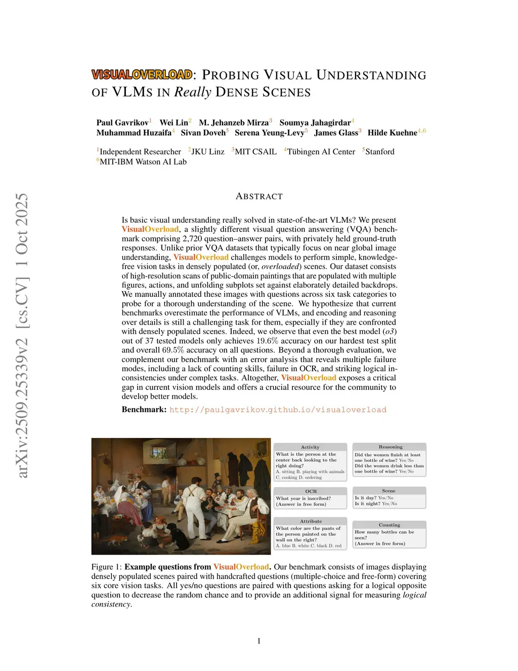 Is basic visual understanding really solved in state-of-the-art VLMs? We present VisualOverload, a slightly different visual question answering (VQA) benchmark comprising 2,720 question-answer pairs, with privately held ground-truth responses. Unlike prior VQA datasets that typically focus on near global image understanding, VisualOverload challenges models to perform simple, knowledge-free vision tasks in densely populated (or, overloaded) scenes. Our dataset consists of high-resolution scans of public-domain paintings that are populated with multiple figures, actions, and unfolding subplots set against elaborately detailed backdrops. We manually annotated these images with questions across six task categories to probe for a thorough understanding of the scene. We hypothesize that current benchmarks overestimate the performance of VLMs, and encoding and reasoning over details is still a challenging task for them, especially if they are confronted with densely populated scenes. Indeed, we observe that even the best model (o3) out of 37 tested models only achieves 19.6% accuracy on our hardest test split and overall 69.5% accuracy on all questions. Beyond a thorough evaluation, we complement our benchmark with an error analysis that reveals multiple failure modes, including a lack of counting skills, failure in OCR, and striking logical inconsistencies under complex tasks. Altogether, VisualOverload exposes a critical gap in current vision models and offers a crucial resource for the community to develop better models.Benchmark:this http URL