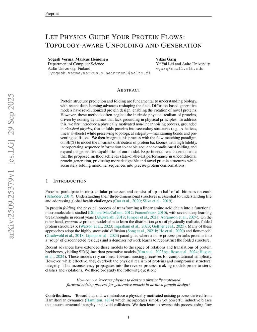 Protein structure prediction and folding are fundamental to understanding biology, with recent deep learning advances reshaping the field. Diffusion-based generative models have revolutionized protein design, enabling the creation of novel proteins. However, these methods often neglect the intrinsic physical realism of proteins, driven by noising dynamics that lack grounding in physical principles. To address this, we first introduce a physically motivated non-linear noising process, grounded in classical physics, that unfolds proteins into secondary structures (e.g., alpha helices, linear beta sheets) while preserving topological integrity--maintaining bonds, and preventing collisions. We then integrate this process with the flow-matching paradigm on SE(3) to model the invariant distribution of protein backbones with high fidelity, incorporating sequence information to enable sequence-conditioned folding and expand the generative capabilities of our model. Experimental results demonstrate that the proposed method achieves state-of-the-art performance in unconditional protein generation, producing more designable and novel protein structures while accurately folding monomer sequences into precise protein conformations.