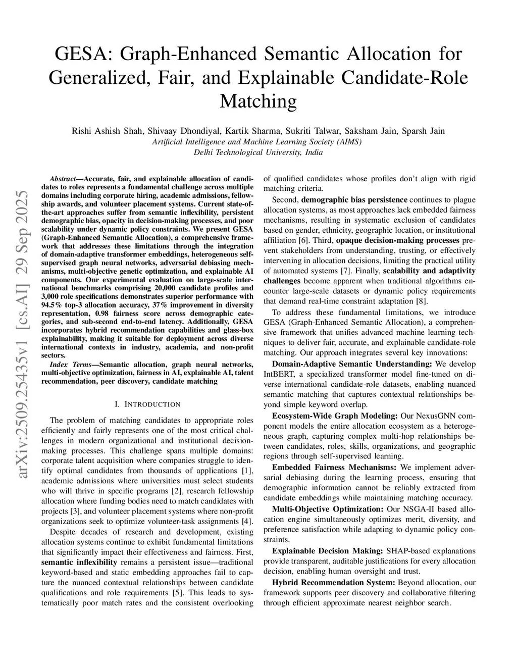 Accurate, fair, and explainable allocation of candidates to roles represents a fundamental challenge across multiple domains including corporate hiring, academic admissions, fellowship awards, and volunteer placement systems. Current state-of-the-art approaches suffer from semantic inflexibility, persistent demographic bias, opacity in decision-making processes, and poor scalability under dynamic policy constraints. We present GESA (Graph-Enhanced Semantic Allocation), a comprehensive framework that addresses these limitations through the integration of domain-adaptive transformer embeddings, heterogeneous self-supervised graph neural networks, adversarial debiasing mechanisms, multi-objective genetic optimization, and explainable AI components. Our experimental evaluation on large-scale international benchmarks comprising 20,000 candidate profiles and 3,000 role specifications demonstrates superior performance with 94.5% top-3 allocation accuracy, 37% improvement in diversity representation, 0.98 fairness score across demographic cate- gories, and sub-second end-to-end latency. Additionally, GESA incorporates hybrid recommendation capabilities and glass-box explainability, making it suitable for deployment across diverse international contexts in industry, academia, and non-profit sectors.