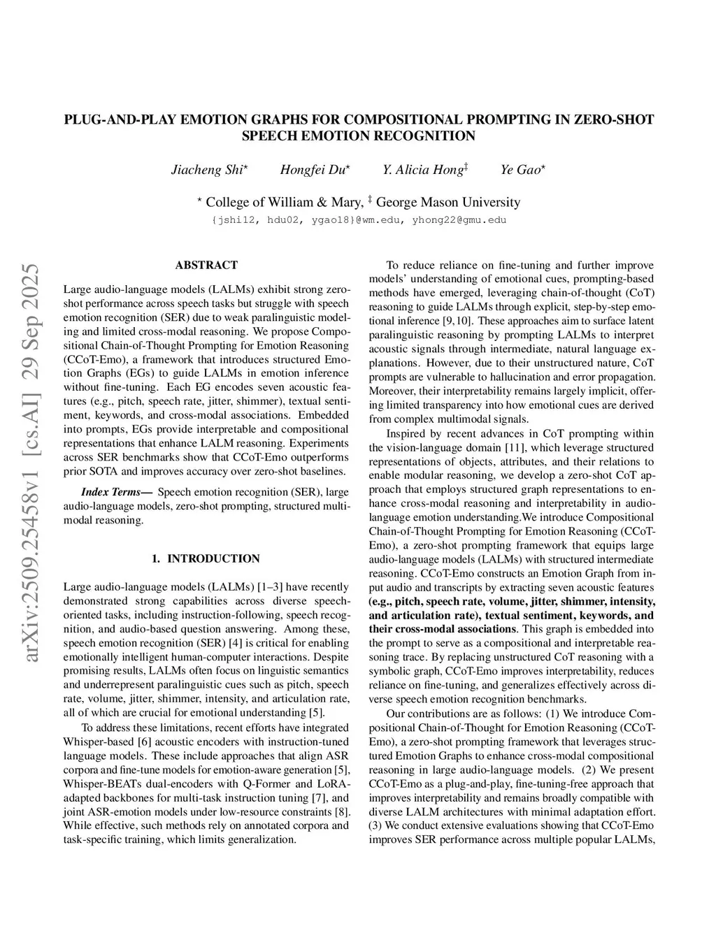 Large audio-language models (LALMs) exhibit strong zero-shot performance across speech tasks but struggle with speech emotion recognition (SER) due to weak paralinguistic modeling and limited cross-modal reasoning. We propose Compositional Chain-of-Thought Prompting for Emotion Reasoning (CCoT-Emo), a framework that introduces structured Emotion Graphs (EGs) to guide LALMs in emotion inference without fine-tuning. Each EG encodes seven acoustic features (e.g., pitch, speech rate, jitter, shimmer), textual sentiment, keywords, and cross-modal associations. Embedded into prompts, EGs provide interpretable and compositional representations that enhance LALM reasoning. Experiments across SER benchmarks show that CCoT-Emo outperforms prior SOTA and improves accuracy over zero-shot baselines.