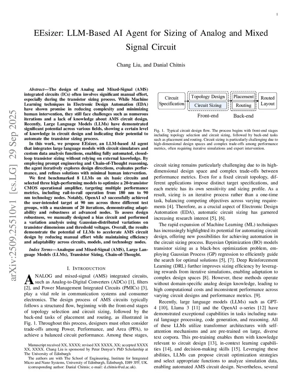 The design of Analog and Mixed-Signal (AMS) integrated circuits (ICs) often involves significant manual effort, especially during the transistor sizing process. While Machine Learning techniques in Electronic Design Automation (EDA) have shown promise in reducing complexity and minimizing human intervention, they still face challenges such as numerous iterations and a lack of knowledge about AMS circuit design. Recently, Large Language Models (LLMs) have demonstrated significant potential across various fields, showing a certain level of knowledge in circuit design and indicating their potential to automate the transistor sizing process. In this work, we propose EEsizer, an LLM-based AI agent that integrates large language models with circuit simulators and custom data analysis functions, enabling fully automated, closed-loop transistor sizing without relying on external knowledge. By employing prompt engineering and Chain-of-Thought reasoning, the agent iteratively explores design directions, evaluates performance, and refines solutions with minimal human intervention. We first benchmarked 8 LLMs on six basic circuits and selected three high-performing models to optimize a 20-transistor CMOS operational amplifier, targeting multiple performance metrics, including rail-to-rail operation from 180 nm to 90 nm technology nodes. Notably, OpenAI o3 successfully achieved the user-intended target at 90 nm across three different test groups, with a maximum of 20 iterations, demonstrating adaptability and robustness at advanced nodes. To assess design robustness, we manually designed a bias circuit and performed a variation analysis using Gaussian-distributed variations on transistor dimensions and threshold voltages.
