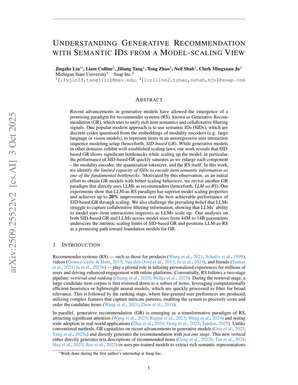 Recent advancements in generative models have allowed the emergence of a promising paradigm for recommender systems (RS), known as Generative Recommendation (GR), which tries to unify rich item semantics and collaborative filtering signals. One popular modern approach is to use semantic IDs (SIDs), which are discrete codes quantized from the embeddings of modality encoders (e.g., large language or vision models), to represent items in an autoregressive user interaction sequence modeling setup (henceforth, SID-based GR). While generative models in other domains exhibit well-established scaling laws, our work reveals that SID-based GR shows significant bottlenecks while scaling up the model. In particular, the performance of SID-based GR quickly saturates as we enlarge each component: the modality encoder, the quantization tokenizer, and the RS itself. In this work, we identify the limited capacity of SIDs to encode item semantic information as one of the fundamental bottlenecks. Motivated by this observation, as an initial effort to obtain GR models with better scaling behaviors, we revisit another GR paradigm that directly uses large language models (LLMs) as recommenders (henceforth, LLM-as-RS). Our experiments show that the LLM-as-RS paradigm has superior model scaling properties and achieves up to 20 percent improvement over the best achievable performance of SID-based GR through scaling. We also challenge the prevailing belief that LLMs struggle to capture collaborative filtering information, showing that their ability to model user-item interactions improves as LLMs scale up. Our analyses on both SID-based GR and LLMs across model sizes from 44M to 14B parameters underscore the intrinsic scaling limits of SID-based GR and position LLM-as-RS as a promising path toward foundation models for GR.