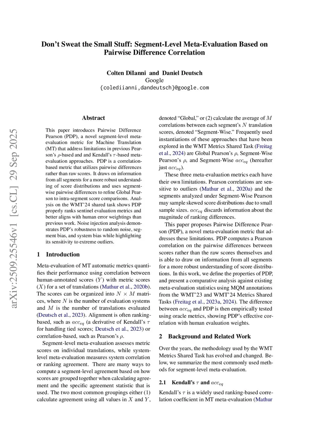 This paper introduces Pairwise Difference Pearson (PDP), a novel segment-level meta-evaluation metric for Machine Translation (MT) that address limitations in previous Pearson's -based and and Kendall's -based meta-evaluation approaches. PDP is a correlation-based metric that utilizes pairwise differences rather than raw scores. It draws on information from all segments for a more robust understanding of score distributions and uses segment-wise pairwise differences to refine Global Pearson to intra-segment score comparisons. Analysis on the WMT'24 shared task shows PDP properly ranks sentinel evaluation metrics and better aligns with human error weightings than previous work. Noise injection analysis demonstrates PDP's robustness to random noise, segment bias, and system bias while highlighting its sensitivity to extreme outliers.