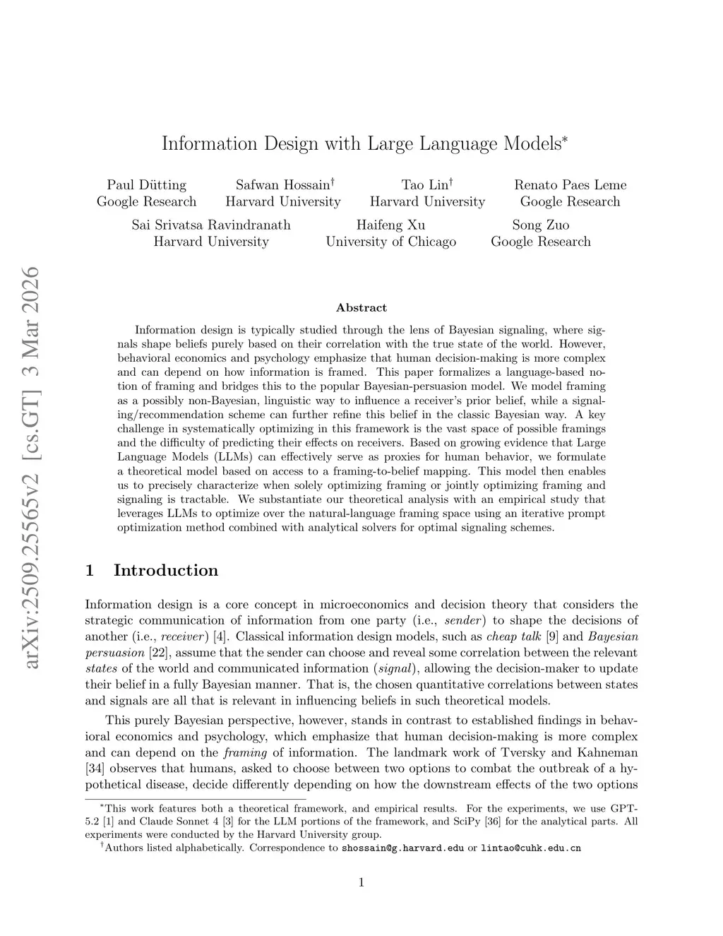 Information design is typically studied through the lens of Bayesian signaling, where signals shape beliefs purely based on their correlation with the true state of the world. However, behavioral economics and psychology emphasize that human decision-making is more complex and can depend on how information is framed. This paper formalizes a language-based notion of framing and bridges this to the popular Bayesian-persuasion model. We model framing as a possibly non-Bayesian, linguistic way to influence a receiver's prior belief, while a signaling/recommendation scheme can further refine this belief in the classic Bayesian way. A key challenge in systematically optimizing in this framework is the vast space of possible framings and the difficulty of predicting their effects on receivers. Based on growing evidence that Large Language Models (LLMs) can effectively serve as proxies for human behavior, we formulate a theoretical model based on access to a framing-to-belief mapping. This model then enables us to precisely characterize when solely optimizing framing or jointly optimizing framing and signaling is tractable. We substantiate our theoretical analysis with an empirical study that leverages LLMs to optimize over the natural-language framing space using an iterative prompt optimization method combined with analytical solvers for optimal signaling schemes.