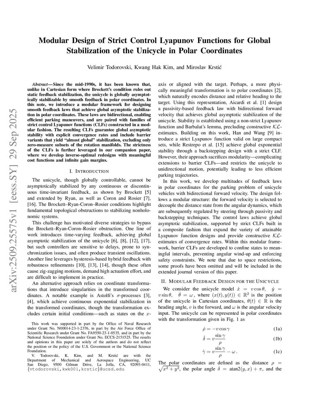 Since the mid-1990s, it has been known that, unlike in Cartesian form where Brockett's condition rules out static feedback stabilization, the unicycle is globally asymptotically stabilizable by smooth feedback in polar coordinates. In this note, we introduce a modular framework for designing smooth feedback laws that achieve global asymptotic stabilization in polar coordinates. These laws are bidirectional, enabling efficient parking maneuvers, and are paired with families of strict control Lyapunov functions (CLFs) constructed in a modular fashion. The resulting CLFs guarantee global asymptotic stability with explicit convergence rates and include barrier variants that yield "almost global" stabilization, excluding only zero-measure subsets of the rotation manifolds. The strictness of the CLFs is further leveraged in our companion paper, where we develop inverse-optimal redesigns with meaningful cost functions and infinite gain margins.