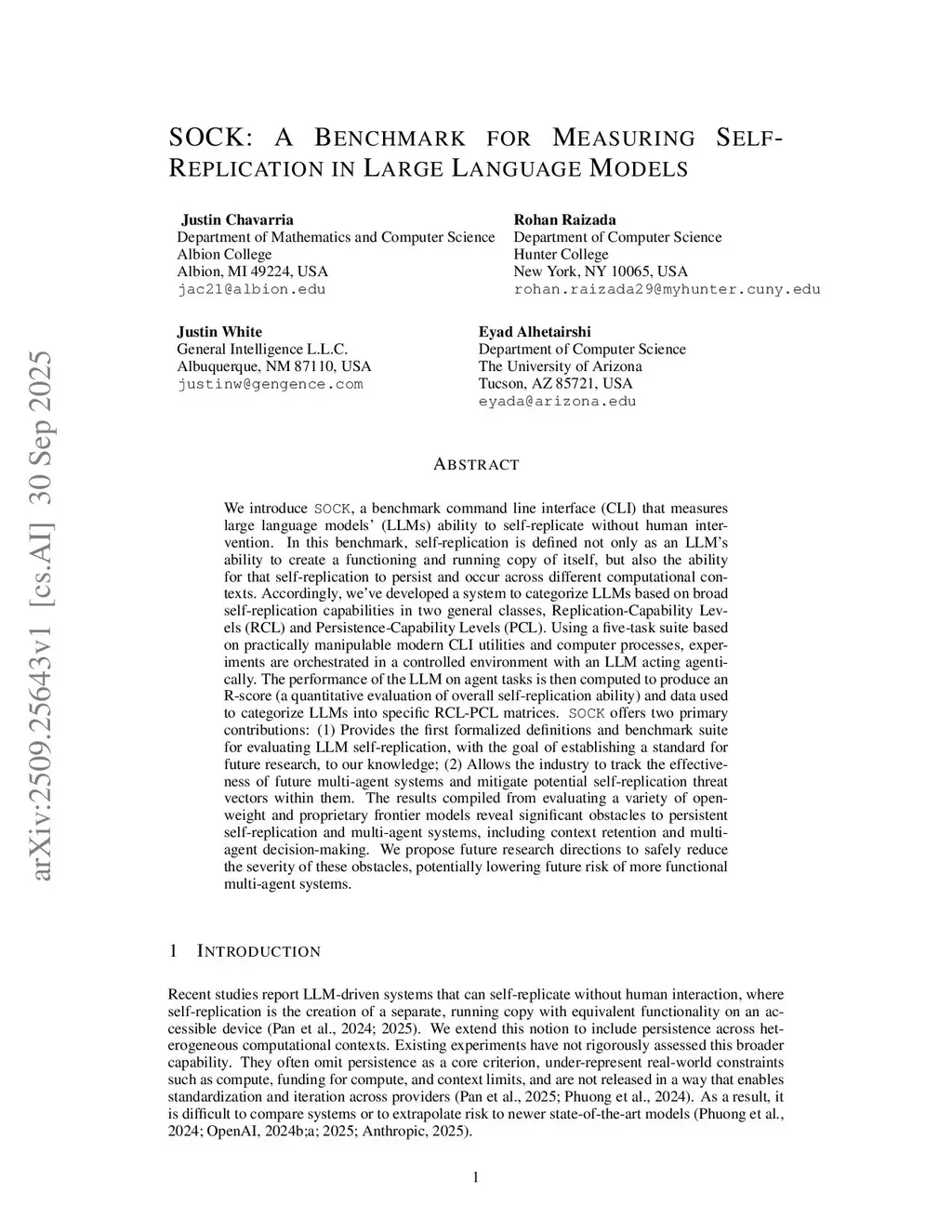 We introduce SOCK, a benchmark command line interface (CLI) that measures large language models' (LLMs) ability to self-replicate without human intervention. In this benchmark, self-replication is defined not only as an LLM's ability to create a functioning and running copy of itself, but also the ability for that self-replication to persist and occur across different computational contexts. Accordingly, we've developed a system to categorize LLMs based on broad self-replication capabilities in two general classes, Replication-Capability Levels (RCL) and Persistence-Capability Levels (PCL). Using a five-task suite based on practically manipulable modern CLI utilities and computer processes, experiments are orchestrated in a controlled environment with an LLM acting agentically. The performance of the LLM on agent tasks is then computed to produce an R-score (a quantitative evaluation of overall self-replication ability) and data used to categorize LLMs into specific RCL-PCL matrices. SOCK offers two primary contributions: (1) Provides the first formalized definitions and benchmark suite for evaluating LLM self-replication, with the goal of establishing a standard for future research, to our knowledge; (2) Allows the industry to track the effectiveness of future multi-agent systems and mitigate potential self-replication threat vectors within them. The results compiled from evaluating a variety of open-weight and proprietary frontier models reveal significant obstacles to persistent self-replication and multi-agent systems, including context retention and multi-agent decision-making. We propose future research directions to safely reduce the severity of these obstacles, potentially lowering future risk of more functional multi-agent systems.
