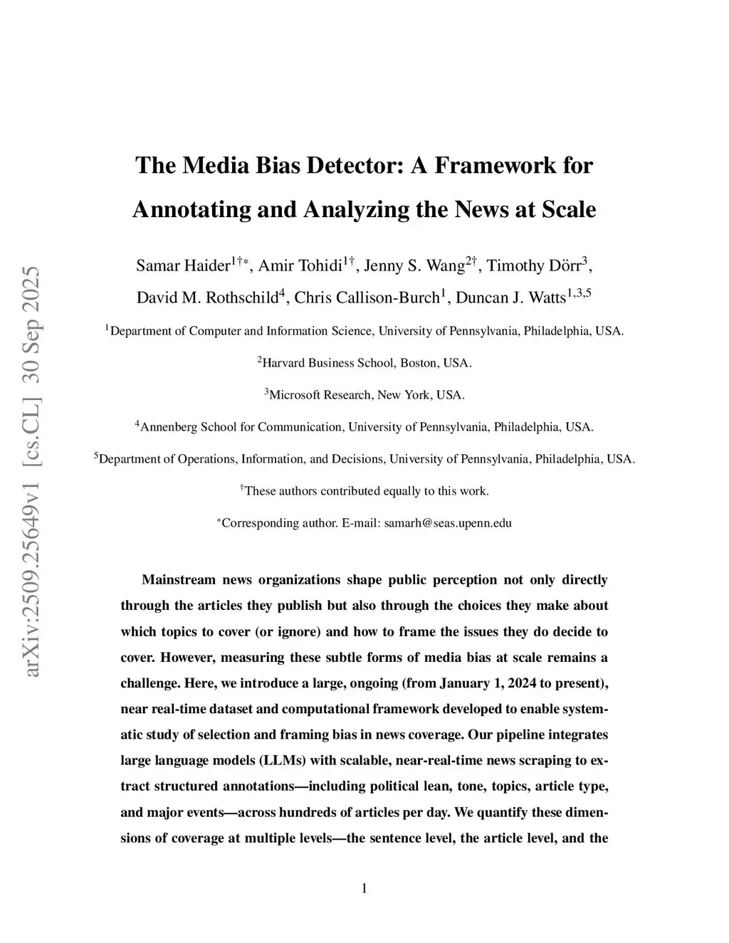 Mainstream news organizations shape public perception not only directly through the articles they publish but also through the choices they make about which topics to cover (or ignore) and how to frame the issues they do decide to cover. However, measuring these subtle forms of media bias at scale remains a challenge. Here, we introduce a large, ongoing (from January 1, 2024 to present), near real-time dataset and computational framework developed to enable systematic study of selection and framing bias in news coverage. Our pipeline integrates large language models (LLMs) with scalable, near-real-time news scraping to extract structured annotations -- including political lean, tone, topics, article type, and major events -- across hundreds of articles per day. We quantify these dimensions of coverage at multiple levels -- the sentence level, the article level, and the publisher level -- expanding the ways in which researchers can analyze media bias in the modern news landscape. In addition to a curated dataset, we also release an interactive web platform for convenient exploration of these data. Together, these contributions establish a reusable methodology for studying media bias at scale, providing empirical resources for future research. Leveraging the breadth of the corpus over time and across publishers, we also present some examples (focused on the 150,000+ articles examined in 2024) that illustrate how this novel data set can reveal insightful patterns in news coverage and bias, supporting academic research and real-world efforts to improve media accountability.