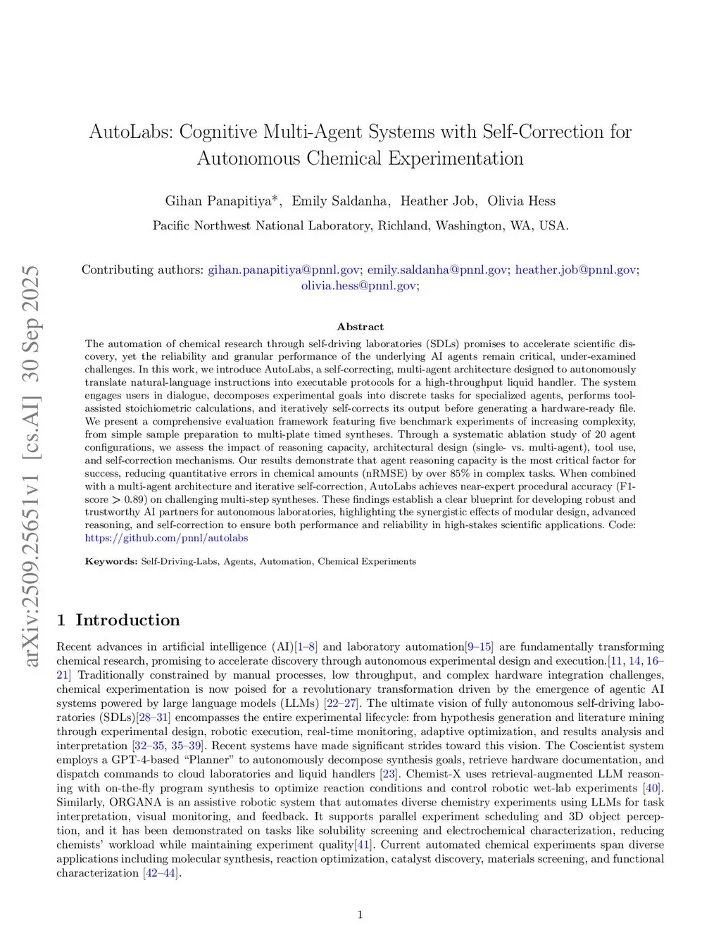 The automation of chemical research through self-driving laboratories (SDLs) promises to accelerate scientific discovery, yet the reliability and granular performance of the underlying AI agents remain critical, under-examined challenges. In this work, we introduce AutoLabs, a self-correcting, multi-agent architecture designed to autonomously translate natural-language instructions into executable protocols for a high-throughput liquid handler. The system engages users in dialogue, decomposes experimental goals into discrete tasks for specialized agents, performs tool-assisted stoichiometric calculations, and iteratively self-corrects its output before generating a hardware-ready file. We present a comprehensive evaluation framework featuring five benchmark experiments of increasing complexity, from simple sample preparation to multi-plate timed syntheses. Through a systematic ablation study of 20 agent configurations, we assess the impact of reasoning capacity, architectural design (single- vs. multi-agent), tool use, and self-correction mechanisms. Our results demonstrate that agent reasoning capacity is the most critical factor for success, reducing quantitative errors in chemical amounts (nRMSE) by over 85% in complex tasks. When combined with a multi-agent architecture and iterative self-correction, AutoLabs achieves near-expert procedural accuracy (F1-score > 0.89) on challenging multi-step syntheses. These findings establish a clear blueprint for developing robust and trustworthy AI partners for autonomous laboratories, highlighting the synergistic effects of modular design, advanced reasoning, and self-correction to ensure both performance and reliability in high-stakes scientific applications. Code:this https URL