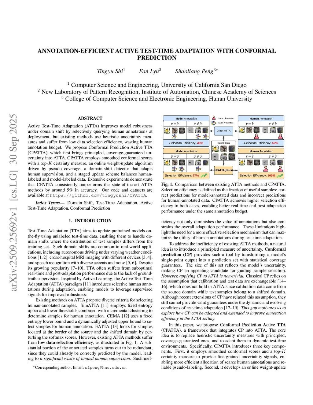 Active Test-Time Adaptation (ATTA) improves model robustness under domain shift by selectively querying human annotations at deployment, but existing methods use heuristic uncertainty measures and suffer from low data selection efficiency, wasting human annotation budget. We propose Conformal Prediction Active TTA (CPATTA), which first brings principled, coverage-guaranteed uncertainty into ATTA. CPATTA employs smoothed conformal scores with a top-K certainty measure, an online weight-update algorithm driven by pseudo coverage, a domain-shift detector that adapts human supervision, and a staged update scheme balances human-labeled and model-labeled data. Extensive experiments demonstrate that CPATTA consistently outperforms the state-of-the-art ATTA methods by around 5% in accuracy. Our code and datasets are available atthis https URL.