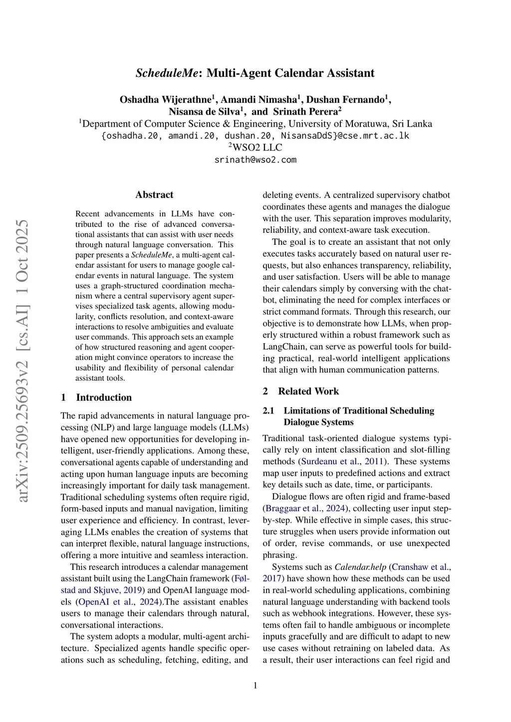 Recent advancements in LLMs have contributed to the rise of advanced conversational assistants that can assist with user needs through natural language conversation. This paper presents a ScheduleMe, a multi-agent calendar assistant for users to manage google calendar events in natural language. The system uses a graph-structured coordination mechanism where a central supervisory agent supervises specialized task agents, allowing modularity, conflicts resolution, and context-aware interactions to resolve ambiguities and evaluate user commands. This approach sets an example of how structured reasoning and agent cooperation might convince operators to increase the usability and flexibility of personal calendar assistant tools.