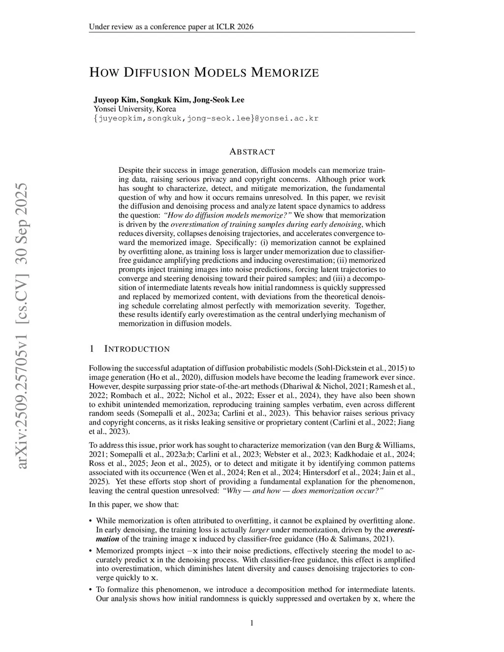 Despite their success in image generation, diffusion models can memorize training data, raising serious privacy and copyright concerns. Although prior work has sought to characterize, detect, and mitigate memorization, the fundamental question of why and how it occurs remains unresolved. In this paper, we revisit the diffusion and denoising process and analyze latent space dynamics to address the question: "How do diffusion models memorize?" We show that memorization is driven by the overestimation of training samples during early denoising, which reduces diversity, collapses denoising trajectories, and accelerates convergence toward the memorized image. Specifically: (i) memorization cannot be explained by overfitting alone, as training loss is larger under memorization due to classifier-free guidance amplifying predictions and inducing overestimation; (ii) memorized prompts inject training images into noise predictions, forcing latent trajectories to converge and steering denoising toward their paired samples; and (iii) a decomposition of intermediate latents reveals how initial randomness is quickly suppressed and replaced by memorized content, with deviations from the theoretical denoising schedule correlating almost perfectly with memorization severity. Together, these results identify early overestimation as the central underlying mechanism of memorization in diffusion models.