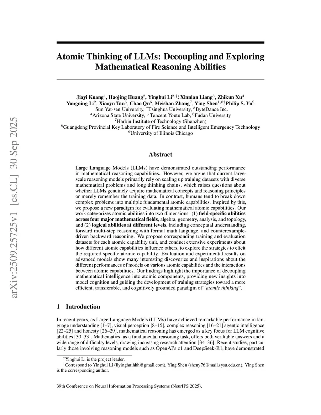 Large Language Models (LLMs) have demonstrated outstanding performance in mathematical reasoning capabilities. However, we argue that current large-scale reasoning models primarily rely on scaling up training datasets with diverse mathematical problems and long thinking chains, which raises questions about whether LLMs genuinely acquire mathematical concepts and reasoning principles or merely remember the training data. In contrast, humans tend to break down complex problems into multiple fundamental atomic capabilities. Inspired by this, we propose a new paradigm for evaluating mathematical atomic capabilities. Our work categorizes atomic abilities into two dimensions: (1) field-specific abilities across four major mathematical fields, algebra, geometry, analysis, and topology, and (2) logical abilities at different levels, including conceptual understanding, forward multi-step reasoning with formal math language, and counterexample-driven backward reasoning. We propose corresponding training and evaluation datasets for each atomic capability unit, and conduct extensive experiments about how different atomic capabilities influence others, to explore the strategies to elicit the required specific atomic capability. Evaluation and experimental results on advanced models show many interesting discoveries and inspirations about the different performances of models on various atomic capabilities and the interactions between atomic capabilities. Our findings highlight the importance of decoupling mathematical intelligence into atomic components, providing new insights into model cognition and guiding the development of training strategies toward a more efficient, transferable, and cognitively grounded paradigm of "atomic thinking".