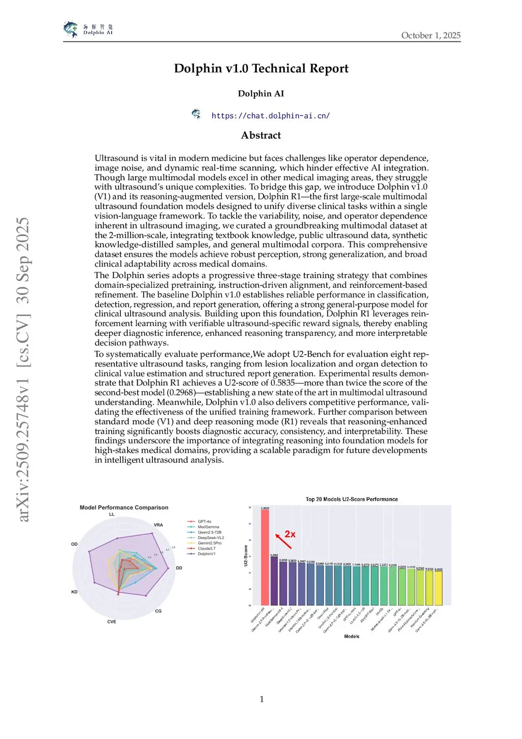 Ultrasound is crucial in modern medicine but faces challenges like operator dependence, image noise, and real-time scanning, hindering AI integration. While large multimodal models excel in other medical imaging areas, they struggle with ultrasound's complexities. To address this, we introduce Dolphin v1.0 (V1) and its reasoning-augmented version, Dolphin R1-the first large-scale multimodal ultrasound foundation models unifying diverse clinical tasks in a single vision-languagethis http URLtackle ultrasound variability and noise, we curated a 2-million-scale multimodal dataset, combining textbook knowledge, public data, synthetic samples, and general corpora. This ensures robust perception, generalization, and clinicalthis http URLDolphin series employs a three-stage training strategy: domain-specialized pretraining, instruction-driven alignment, and reinforcement-based refinement. Dolphin v1.0 delivers reliable performance in classification, detection, regression, and report generation. Dolphin R1 enhances diagnostic inference, reasoning transparency, and interpretability through reinforcement learning with ultrasound-specificthis http URLon U2-Bench across eight ultrasound tasks, Dolphin R1 achieves a U2-score of 0.5835-over twice the second-best model (0.2968) setting a new state of the art. Dolphin v1.0 also performs competitively, validating the unified framework. Comparisons show reasoning-enhanced training significantly improves diagnostic accuracy, consistency, and interpretability, highlighting its importance for high-stakes medical AI.