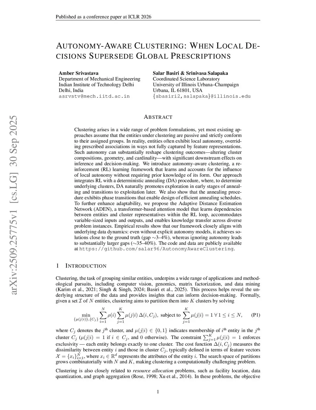 Clustering arises in a wide range of problem formulations, yet most existing approaches assume that the entities under clustering are passive and strictly conform to their assigned groups. In reality, entities often exhibit local autonomy, overriding prescribed associations in ways not fully captured by feature representations. Such autonomy can substantially reshape clustering outcomes -- altering cluster compositions, geometry, and cardinality -- with significant downstream effects on inference and decision-making. We introduce autonomy-aware clustering, a reinforcement learning (RL) framework that learns and accounts for the influence of local autonomy without requiring prior knowledge of its form. Our approach integrates RL with a Deterministic Annealing (DA) procedure, where, to determine underlying clusters, DA naturally promotes exploration in early stages of annealing and transitions to exploitation later. We also show that the annealing procedure exhibits phase transitions that enable design of efficient annealing schedules. To further enhance adaptability, we propose the Adaptive Distance Estimation Network (ADEN), a transformer-based attention model that learns dependencies between entities and cluster representatives within the RL loop, accommodates variable-sized inputs and outputs, and enables knowledge transfer across diverse problem instances. Empirical results show that our framework closely aligns with underlying data dynamics: even without explicit autonomy models, it achieves solutions close to the ground truth (gap ~3-4%), whereas ignoring autonomy leads to substantially larger gaps (~35-40%). The code and data are publicly available atthis https URL.