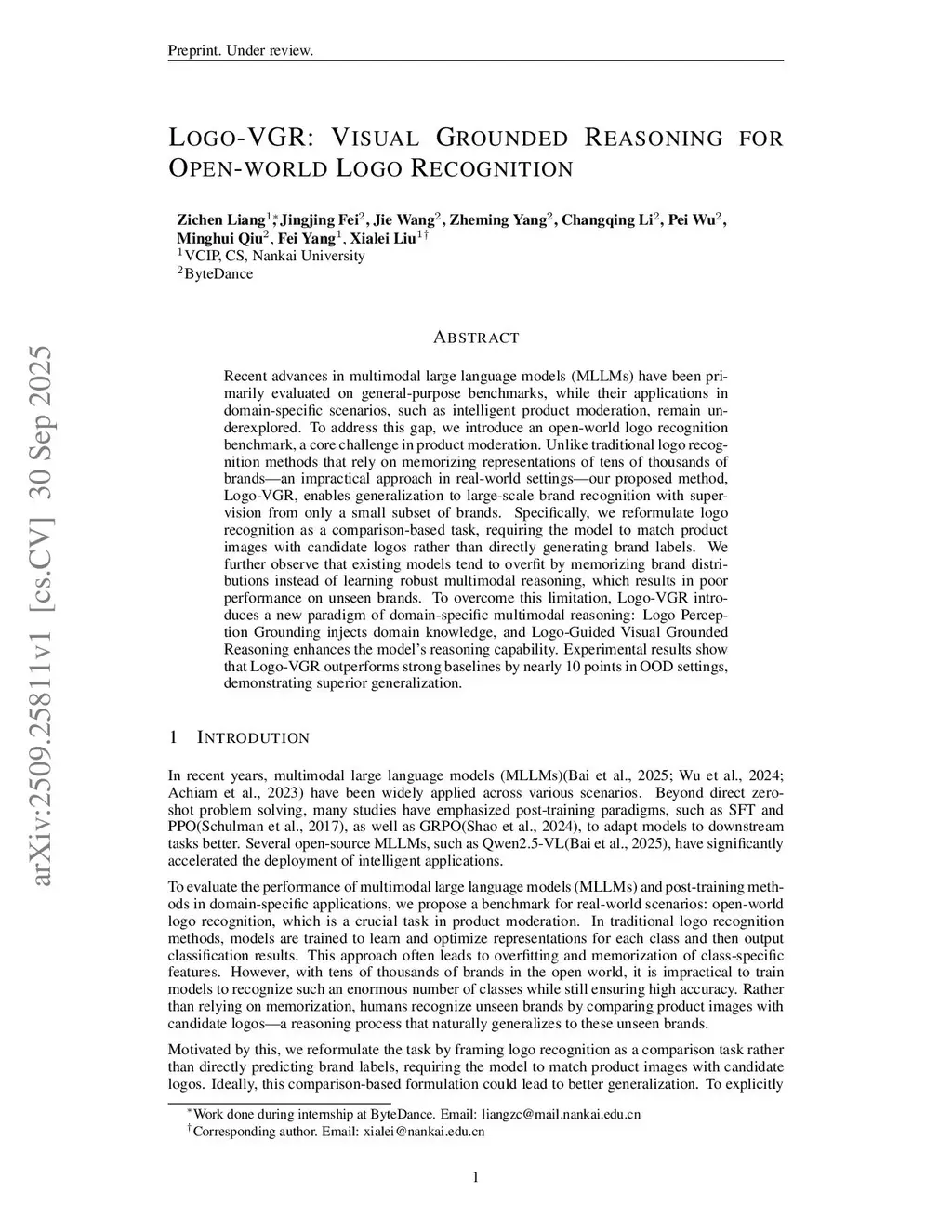 Recent advances in multimodal large language models (MLLMs) have been primarily evaluated on general-purpose benchmarks, while their applications in domain-specific scenarios, such as intelligent product moderation, remain underexplored. To address this gap, we introduce an open-world logo recognition benchmark, a core challenge in product moderation. Unlike traditional logo recognition methods that rely on memorizing representations of tens of thousands of brands-an impractical approach in real-world settings-our proposed method, Logo-VGR, enables generalization to large-scale brand recognition with supervision from only a small subset of brands. Specifically, we reformulate logo recognition as a comparison-based task, requiring the model to match product images with candidate logos rather than directly generating brand labels. We further observe that existing models tend to overfit by memorizing brand distributions instead of learning robust multimodal reasoning, which results in poor performance on unseen brands. To overcome this limitation, Logo-VGR introduces a new paradigm of domain-specific multimodal reasoning: Logo Perception Grounding injects domain knowledge, and Logo-Guided Visual Grounded Reasoning enhances the model's reasoning capability. Experimental results show that Logo-VGR outperforms strong baselines by nearly 10 points in OOD settings, demonstrating superior generalization.