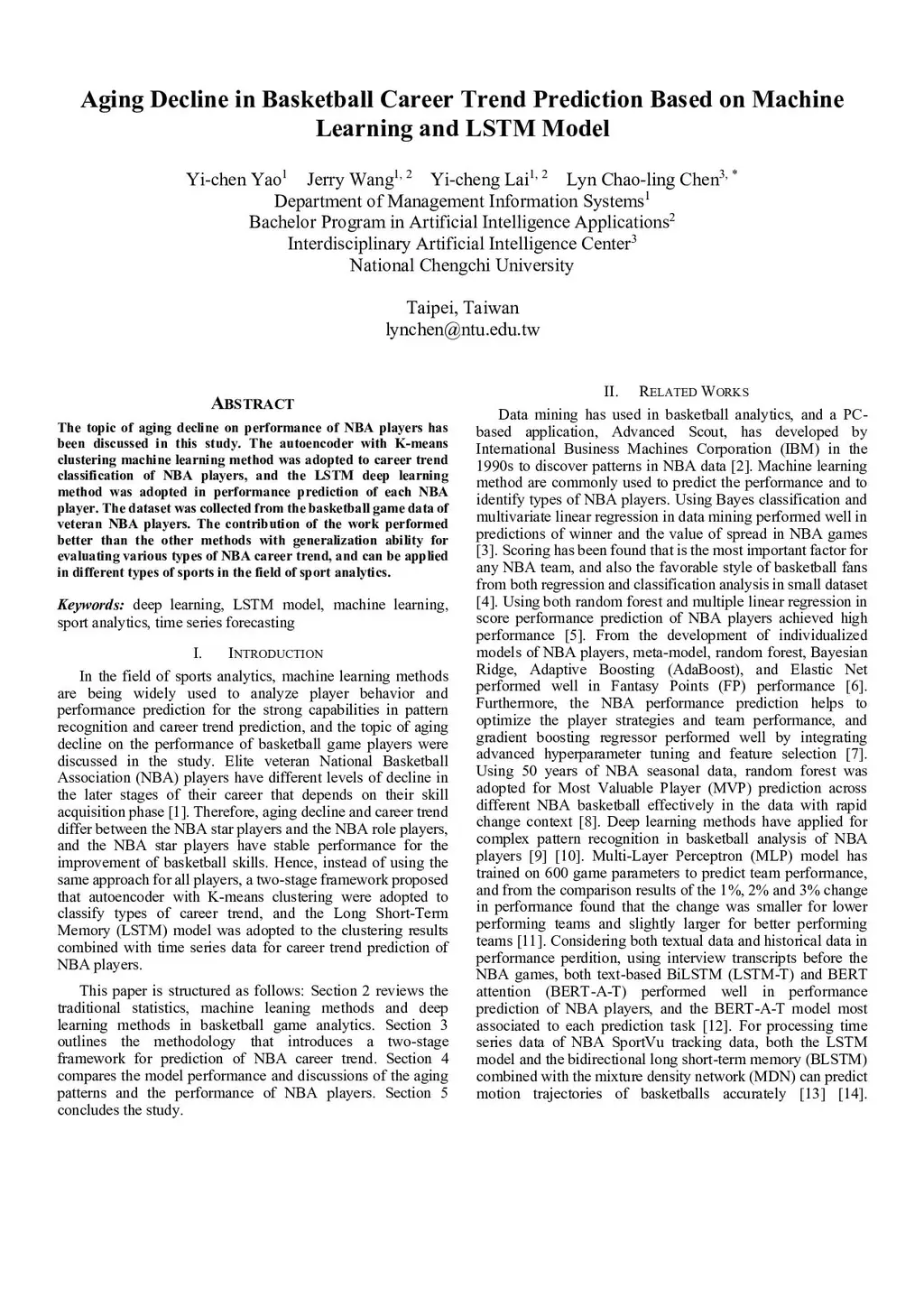 The topic of aging decline on performance of NBA players has been discussed in this study. The autoencoder with K-means clustering machine learning method was adopted to career trend classification of NBA players, and the LSTM deep learning method was adopted in performance prediction of each NBA player. The dataset was collected from the basketball game data of veteran NBA players. The contribution of the work performed better than the other methods with generalization ability for evaluating various types of NBA career trend, and can be applied in different types of sports in the field of sport analytics.