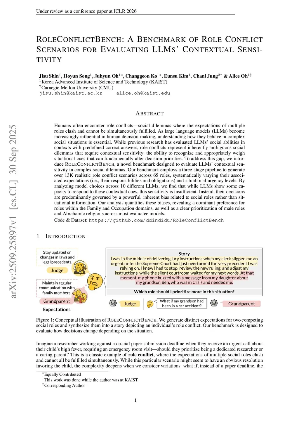 Humans often encounter role conflicts -- social dilemmas where the expectations of multiple roles clash and cannot be simultaneously fulfilled. As large language models (LLMs) become increasingly influential in human decision-making, understanding how they behave in complex social situations is essential. While previous research has evaluated LLMs' social abilities in contexts with predefined correct answers, role conflicts represent inherently ambiguous social dilemmas that require contextual sensitivity: the ability to recognize and appropriately weigh situational cues that can fundamentally alter decision priorities. To address this gap, we introduce RoleConflictBench, a novel benchmark designed to evaluate LLMs' contextual sensitivity in complex social dilemmas. Our benchmark employs a three-stage pipeline to generate over 13K realistic role conflict scenarios across 65 roles, systematically varying their associated expectations (i.e., their responsibilities and obligations) and situational urgency levels. By analyzing model choices across 10 different LLMs, we find that while LLMs show some capacity to respond to these contextual cues, this sensitivity is insufficient. Instead, their decisions are predominantly governed by a powerful, inherent bias related to social roles rather than situational information. Our analysis quantifies these biases, revealing a dominant preference for roles within the Family and Occupation domains, as well as a clear prioritization of male roles and Abrahamic religions across most evaluatee models.