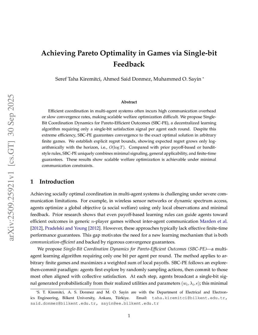 Efficient coordination in multi-agent systems often incurs high communication overhead or slow convergence rates, making scalable welfare optimization difficult. We propose Single-Bit Coordination Dynamics for Pareto-Efficient Outcomes (SBC-PE), a decentralized learning algorithm requiring only a single-bit satisfaction signal per agent each round. Despite this extreme efficiency, SBC-PE guarantees convergence to the exact optimal solution in arbitrary finite games. We establish explicit regret bounds, showing expected regret grows only logarithmically with the horizon, i.e., O(log T). Compared with prior payoff-based or bandit-style rules, SBC-PE uniquely combines minimal signaling, general applicability, and finite-time guarantees. These results show scalable welfare optimization is achievable under minimal communication constraints.