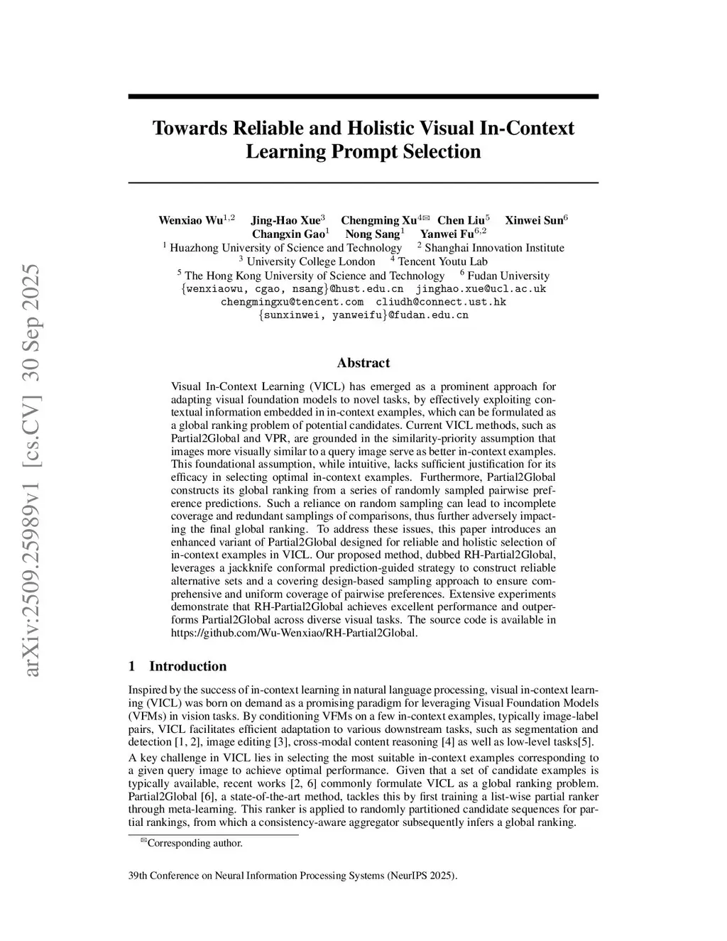 Visual In-Context Learning (VICL) has emerged as a prominent approach for adapting visual foundation models to novel tasks, by effectively exploiting contextual information embedded in in-context examples, which can be formulated as a global ranking problem of potential candidates. Current VICL methods, such as Partial2Global and VPR, are grounded in the similarity-priority assumption that images more visually similar to a query image serve as better in-context examples. This foundational assumption, while intuitive, lacks sufficient justification for its efficacy in selecting optimal in-context examples. Furthermore, Partial2Global constructs its global ranking from a series of randomly sampled pairwise preference predictions. Such a reliance on random sampling can lead to incomplete coverage and redundant samplings of comparisons, thus further adversely impacting the final global ranking. To address these issues, this paper introduces an enhanced variant of Partial2Global designed for reliable and holistic selection of in-context examples in VICL. Our proposed method, dubbed RH-Partial2Global, leverages a jackknife conformal prediction-guided strategy to construct reliable alternative sets and a covering design-based sampling approach to ensure comprehensive and uniform coverage of pairwise preferences. Extensive experiments demonstrate that RH-Partial2Global achieves excellent performance and outperforms Partial2Global across diverse visual tasks.