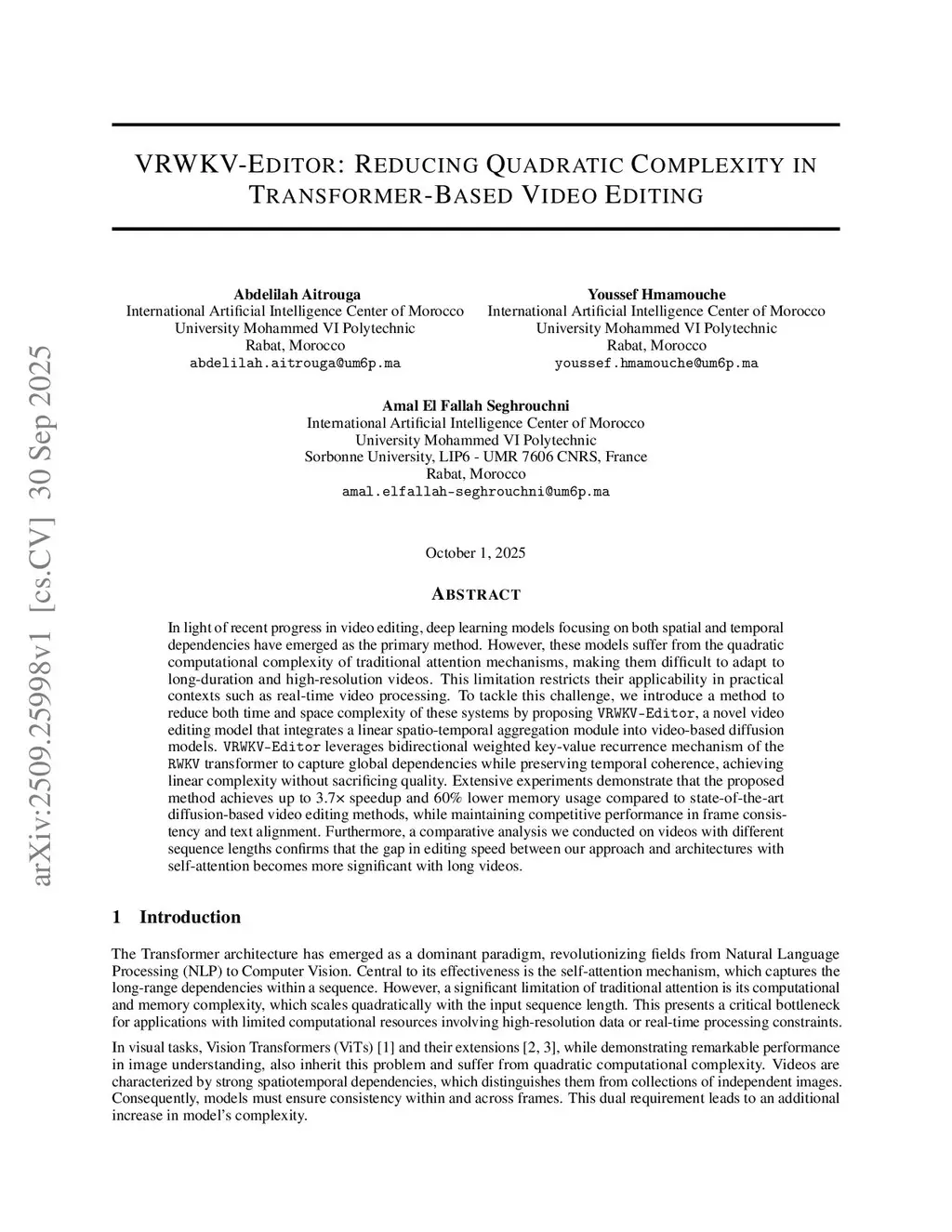 VRWKV-Editor: Reducing quadratic complexity in transformer-based video editing