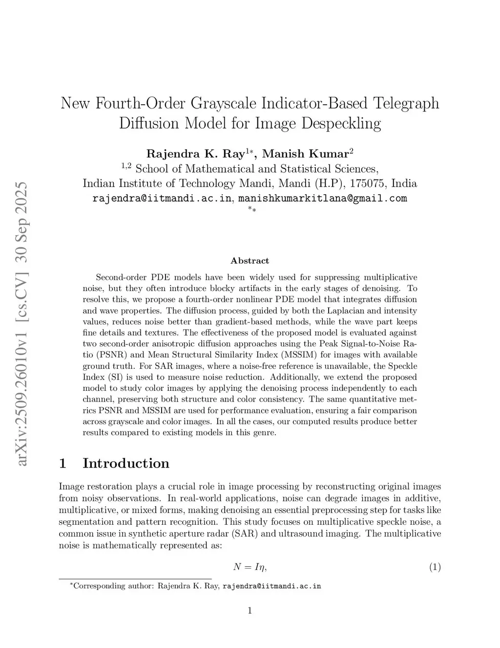 New Fourth-Order Grayscale Indicator-Based Telegraph Diffusion Model for Image Despeckling