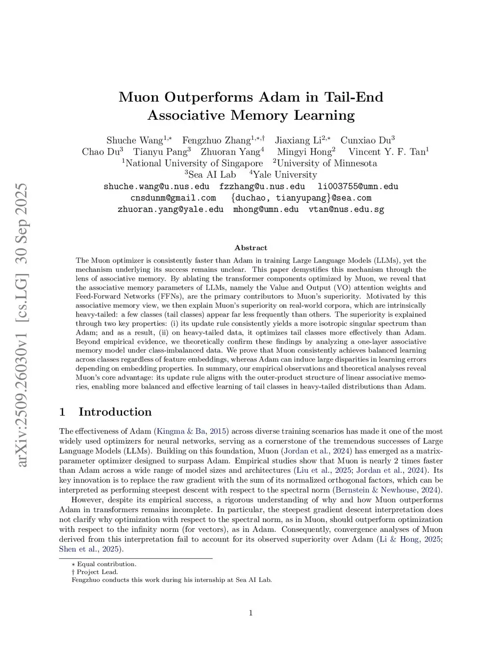 Muon Outperforms Adam in Tail-End Associative Memory Learning