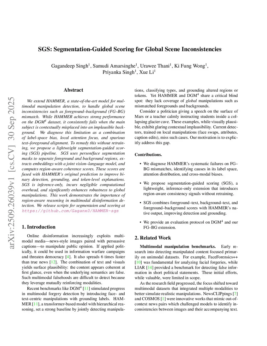 We extend HAMMER, a state-of-the-art model for multimodal manipulation detection, to handle global scene inconsistencies such as foreground-background (FG-BG) mismatch. While HAMMER achieves strong performance on the DGM4 dataset, it consistently fails when the main subject is contextually misplaced into an implausible background. We diagnose this limitation as a combination of label-space bias, local attention focus, and spurious text-foreground alignment. To remedy this without retraining, we propose a lightweight segmentation-guided scoring (SGS) pipeline. SGS uses person/face segmentation masks to separate foreground and background regions, extracts embeddings with a joint vision-language model, and computes region-aware coherence scores. These scores are fused with HAMMER's original prediction to improve binary detection, grounding, and token-level explanations. SGS is inference-only, incurs negligible computational overhead, and significantly enhances robustness to global manipulations. This work demonstrates the importance of region-aware reasoning in multimodal disinformation detection. We release scripts for segmentation and scoring atthis https URL