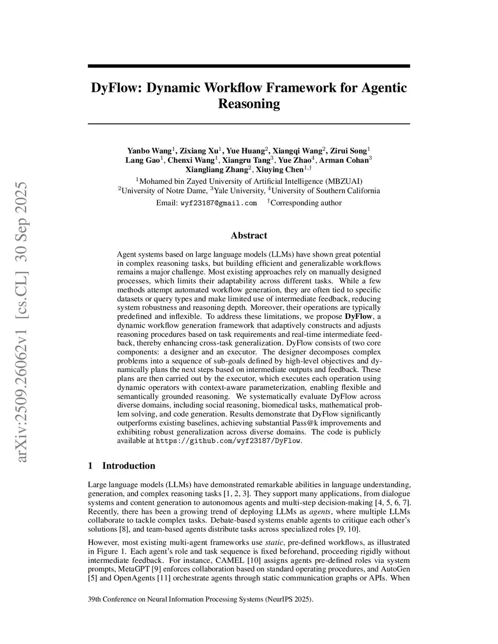 Agent systems based on large language models (LLMs) have shown great potential in complex reasoning tasks, but building efficient and generalizable workflows remains a major challenge. Most existing approaches rely on manually designed processes, which limits their adaptability across different tasks. While a few methods attempt automated workflow generation, they are often tied to specific datasets or query types and make limited use of intermediate feedback, reducing system robustness and reasoning depth. Moreover, their operations are typically predefined and inflexible. To address these limitations, we propose DyFlow, a dynamic workflow generation framework that adaptively constructs and adjusts reasoning procedures based on task requirements and real-time intermediate feedback, thereby enhancing cross-task generalization. DyFlow consists of two core components: a designer and an executor. The designer decomposes complex problems into a sequence of sub-goals defined by high-level objectives and dynamically plans the next steps based on intermediate outputs and feedback. These plans are then carried out by the executor, which executes each operation using dynamic operators with context-aware parameterization, enabling flexible and semantically grounded reasoning. We systematically evaluate DyFlow across diverse domains, including social reasoning, biomedical tasks, mathematical problem solving, and code generation. Results demonstrate that DyFlow significantly outperforms existing baselines, achieving substantial Pass@k improvements and exhibiting robust generalization across diverse domains. The code is publicly available atthis https URL.