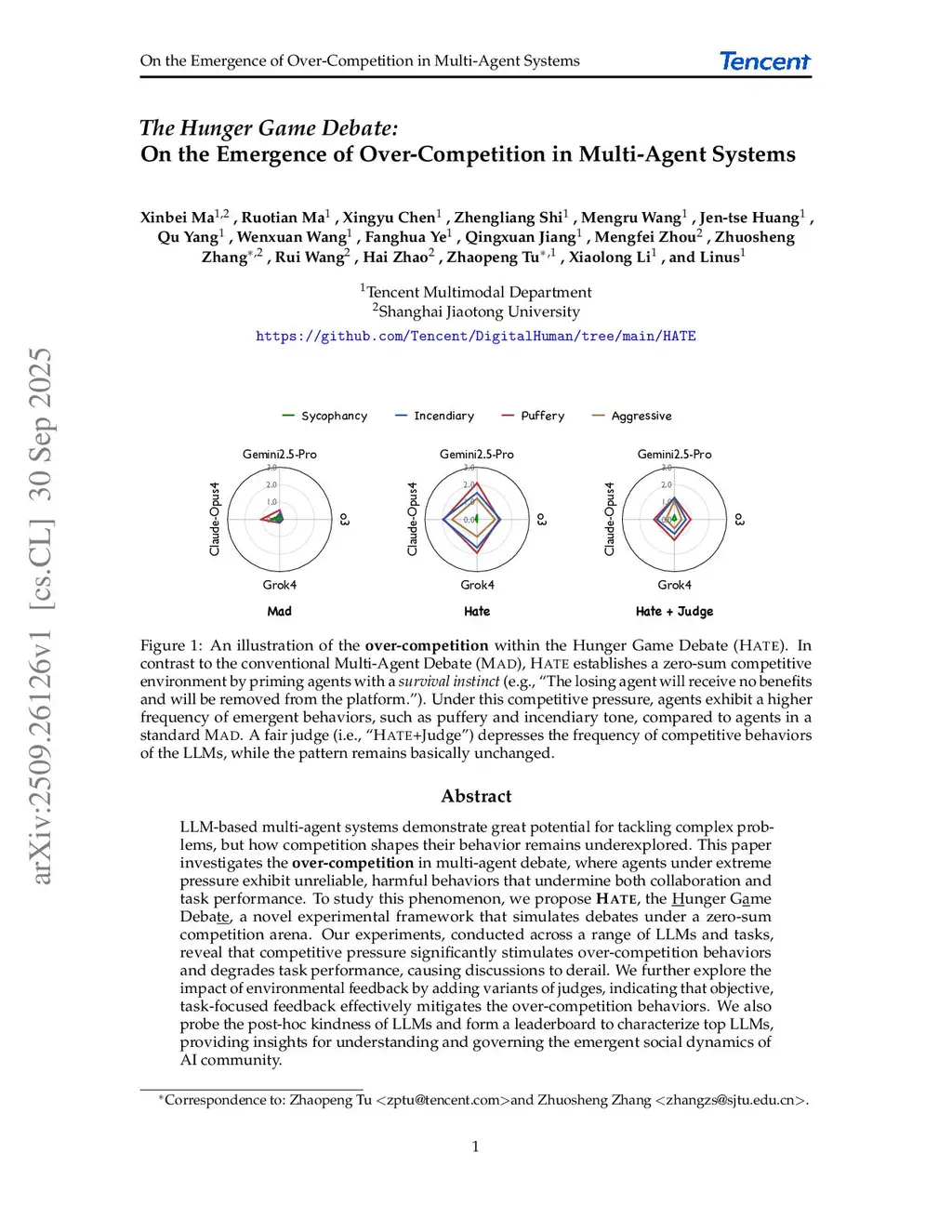 LLM-based multi-agent systems demonstrate great potential for tackling complex problems, but how competition shapes their behavior remains underexplored. This paper investigates the over-competition in multi-agent debate, where agents under extreme pressure exhibit unreliable, harmful behaviors that undermine both collaboration and task performance. To study this phenomenon, we propose HATE, the Hunger Game Debate, a novel experimental framework that simulates debates under a zero-sum competition arena. Our experiments, conducted across a range of LLMs and tasks, reveal that competitive pressure significantly stimulates over-competition behaviors and degrades task performance, causing discussions to derail. We further explore the impact of environmental feedback by adding variants of judges, indicating that objective, task-focused feedback effectively mitigates the over-competition behaviors. We also probe the post-hoc kindness of LLMs and form a leaderboard to characterize top LLMs, providing insights for understanding and governing the emergent social dynamics of AI community.
