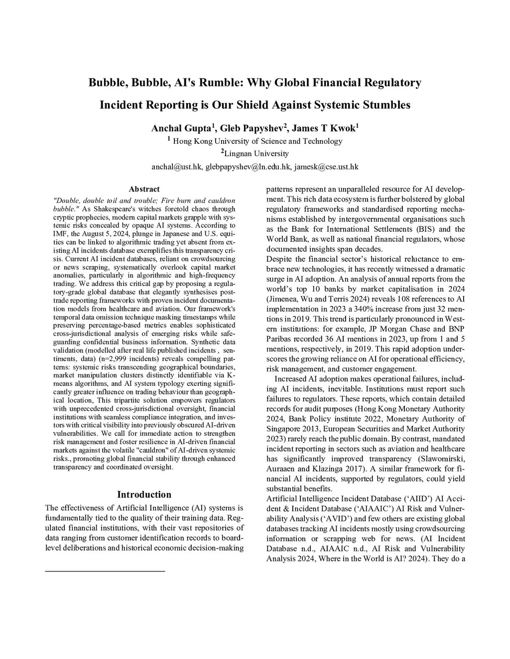 "Double, double toil and trouble; Fire burn and cauldron bubble." As Shakespeare's witches foretold chaos through cryptic prophecies, modern capital markets grapple with systemic risks concealed by opaque AI systems. According to IMF, the August 5, 2024, plunge in Japanese and U.S. equities can be linked to algorithmic trading yet ab-sent from existing AI incidents database exemplifies this transparency crisis. Current AI incident databases, reliant on crowdsourcing or news scraping, systematically over-look capital market anomalies, particularly in algorithmic and high-frequency trading. We address this critical gap by proposing a regulatory-grade global database that elegantly synthesises post-trade reporting frameworks with proven incident documentation models from healthcare and aviation. Our framework's temporal data omission technique masking timestamps while preserving percent-age-based metrics enables sophisticated cross-jurisdictional analysis of emerging risks while safeguarding confidential business information. Synthetic data validation (modelled after real life published incidents , sentiments, data) reveals compelling pat-terns: systemic risks transcending geographical boundaries, market manipulation clusters distinctly identifiable via K-means algorithms, and AI system typology exerting significantly greater influence on trading behaviour than geographical location, This tripartite solution empowers regulators with unprecedented cross-jurisdictional oversight, financial institutions with seamless compliance integration, and investors with critical visibility into previously obscured AI-driven vulnerabilities. We call for immediate action to strengthen risk management and foster resilience in AI-driven financial markets against the volatile "cauldron" of AI-driven systemic risks., promoting global financial stability through enhanced transparency and coordinated oversight.